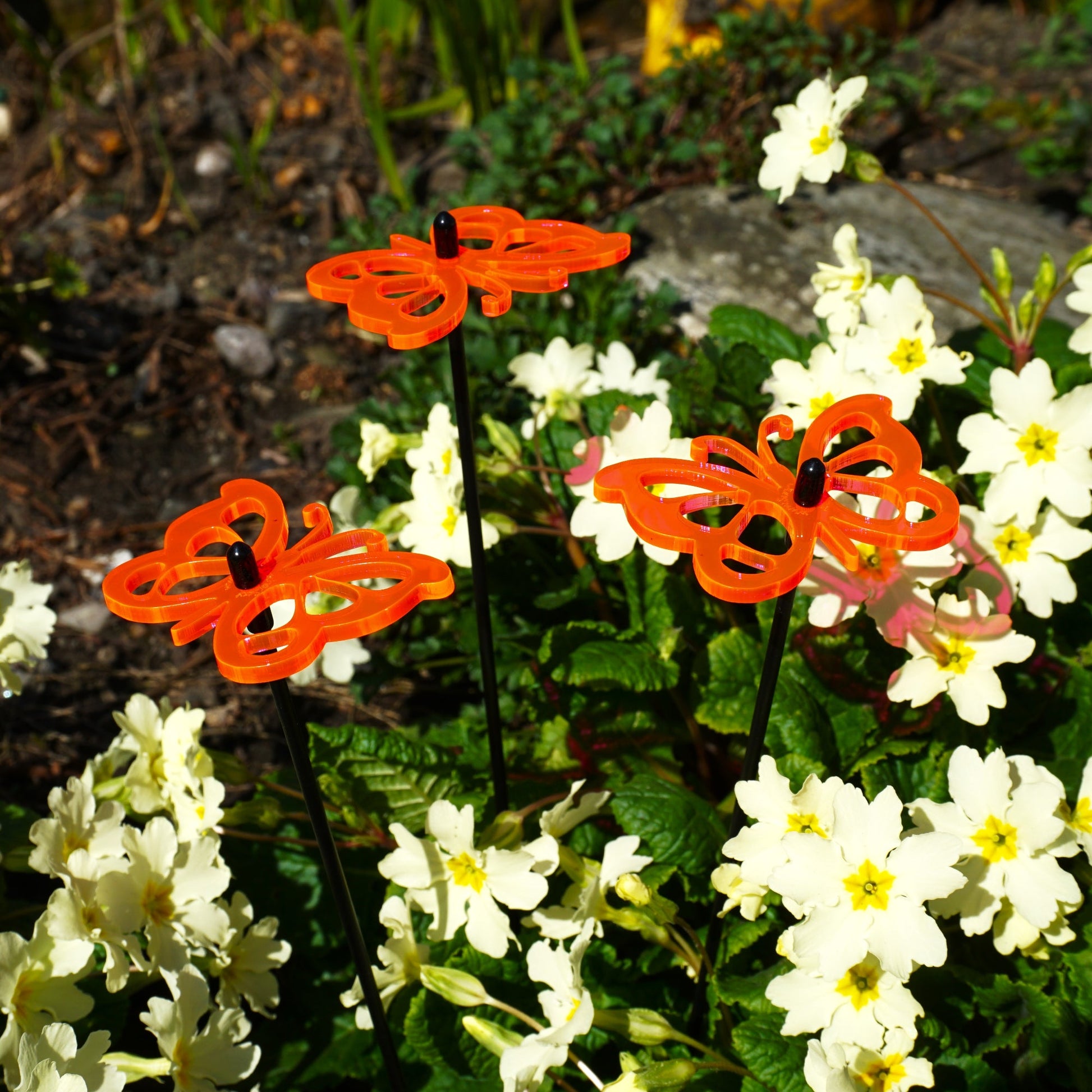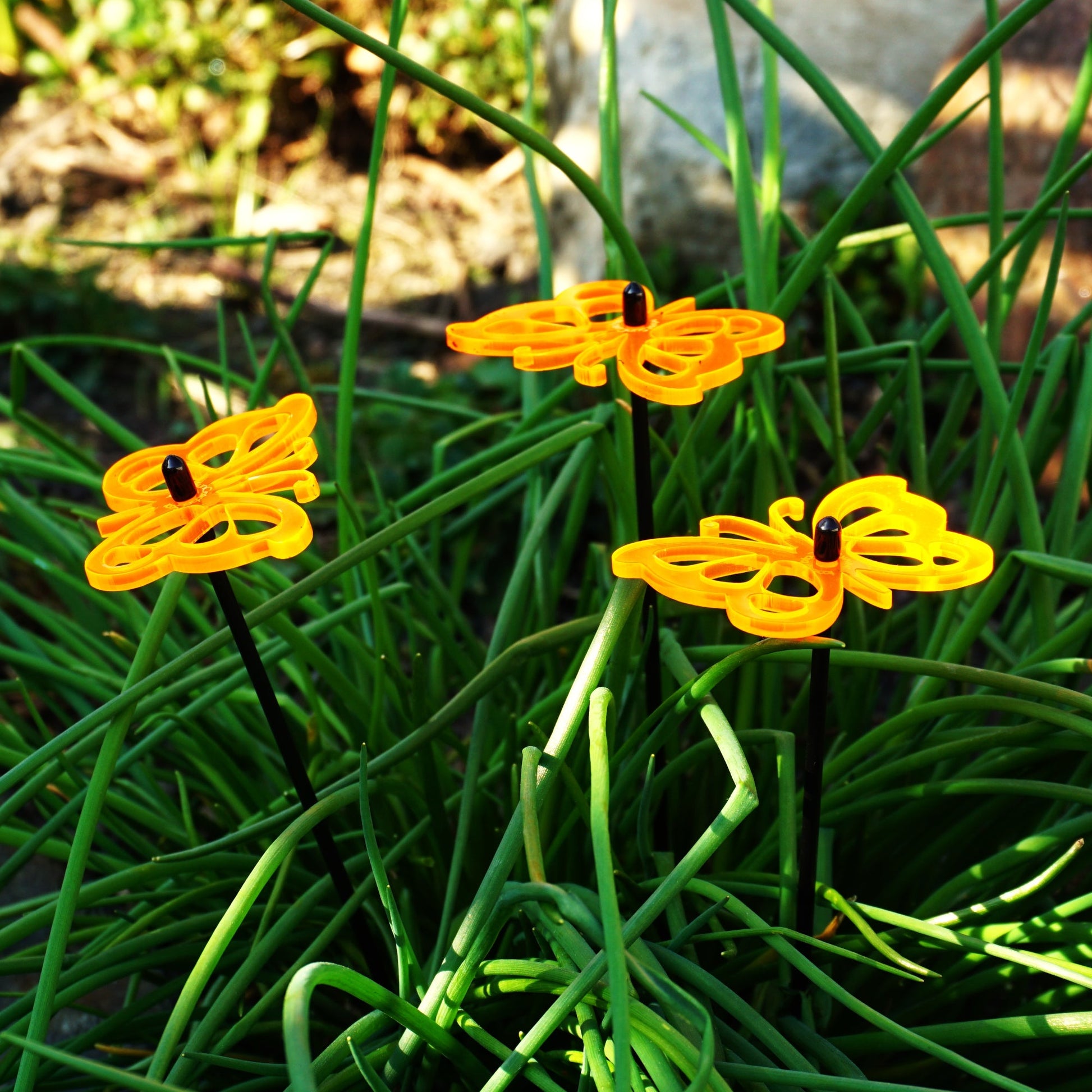 This Set of 3 SunCatchers 'Comma Butterfly' consists of:- a three wide, glowing light collector in red, orange, yellow, green or blue - three 25cm long, black swing rod,- matching support rings and end caps, planted it is about 70cm high and looks great in your flower bed or pot.