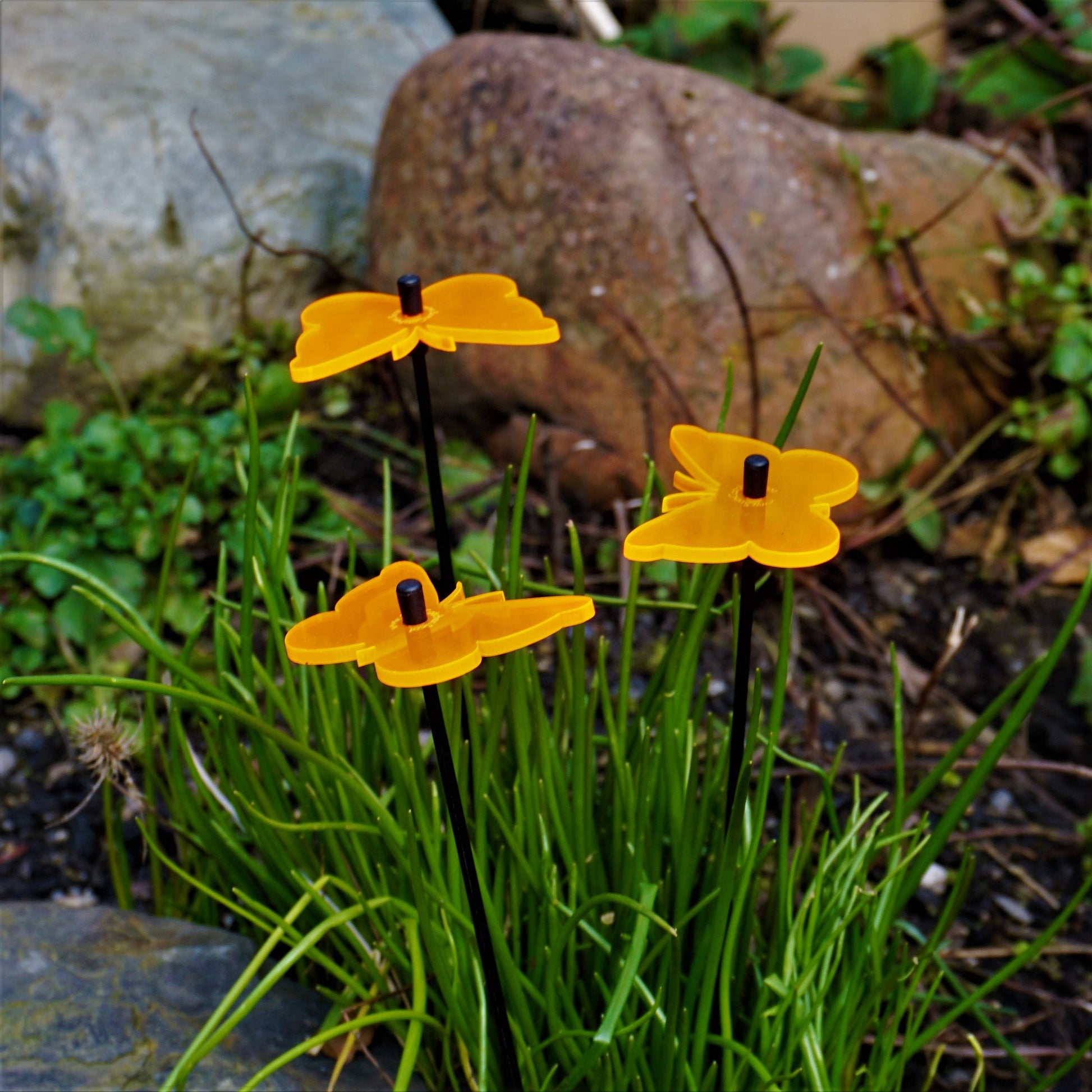 This Set of 3 SunCatcher 'Gatekeeper Butterfly' consists of:- three wide, glowing light collector in red, orange, yellow, green or blue - three 25cm long, black swing rod, - matching support rings and end caps. Planted it is about 20cm high and looks great in your flower bed or pot.
