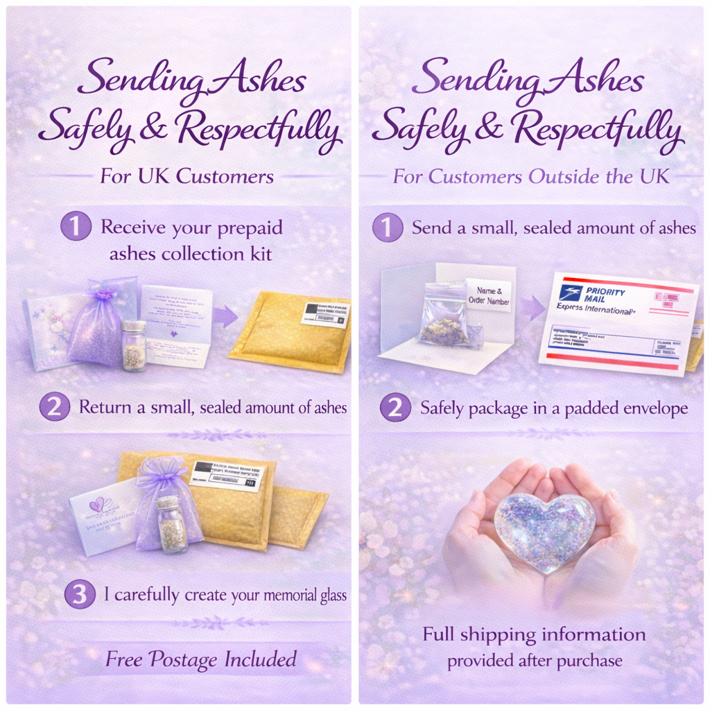 Every piece is individually blown in my studio, with ashes gently mixed and fused alongside crushed silver flakes into the molten glass, becoming a permanent part of the design and a meaningful reminder of cherished memories. (1 teaspoon of ashes per item)