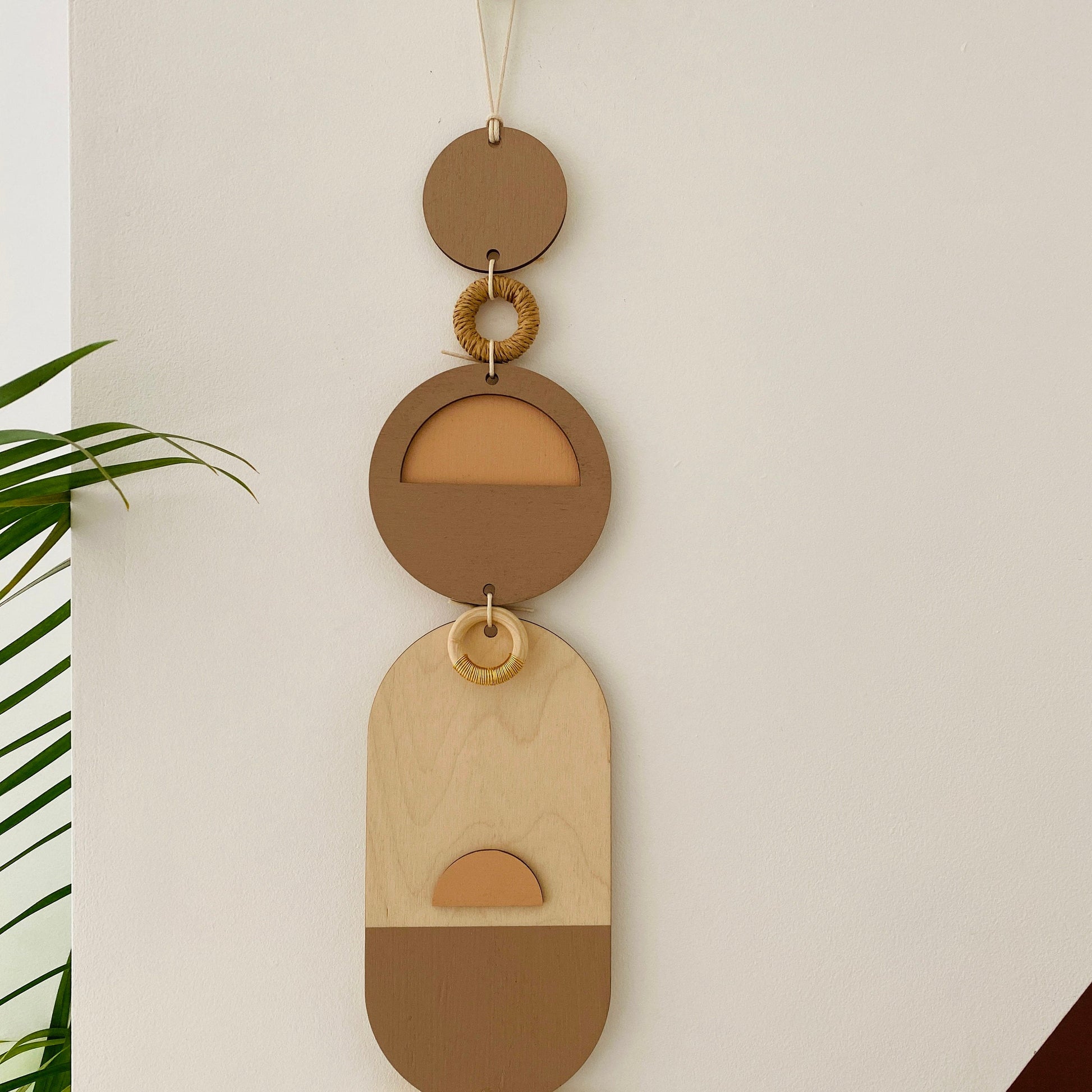 Lovingly handmade modern wall art. This Piece is made from plywood, paint, metal, waxed cord and wooden beads. The colours used are a soft pink, naturals and gold. This slim wall hanging would make a beautiful addition to any room to create a modern mid-century feel. Made from sustainable plywood, hand painted and constructed in Milton Keynes, England.