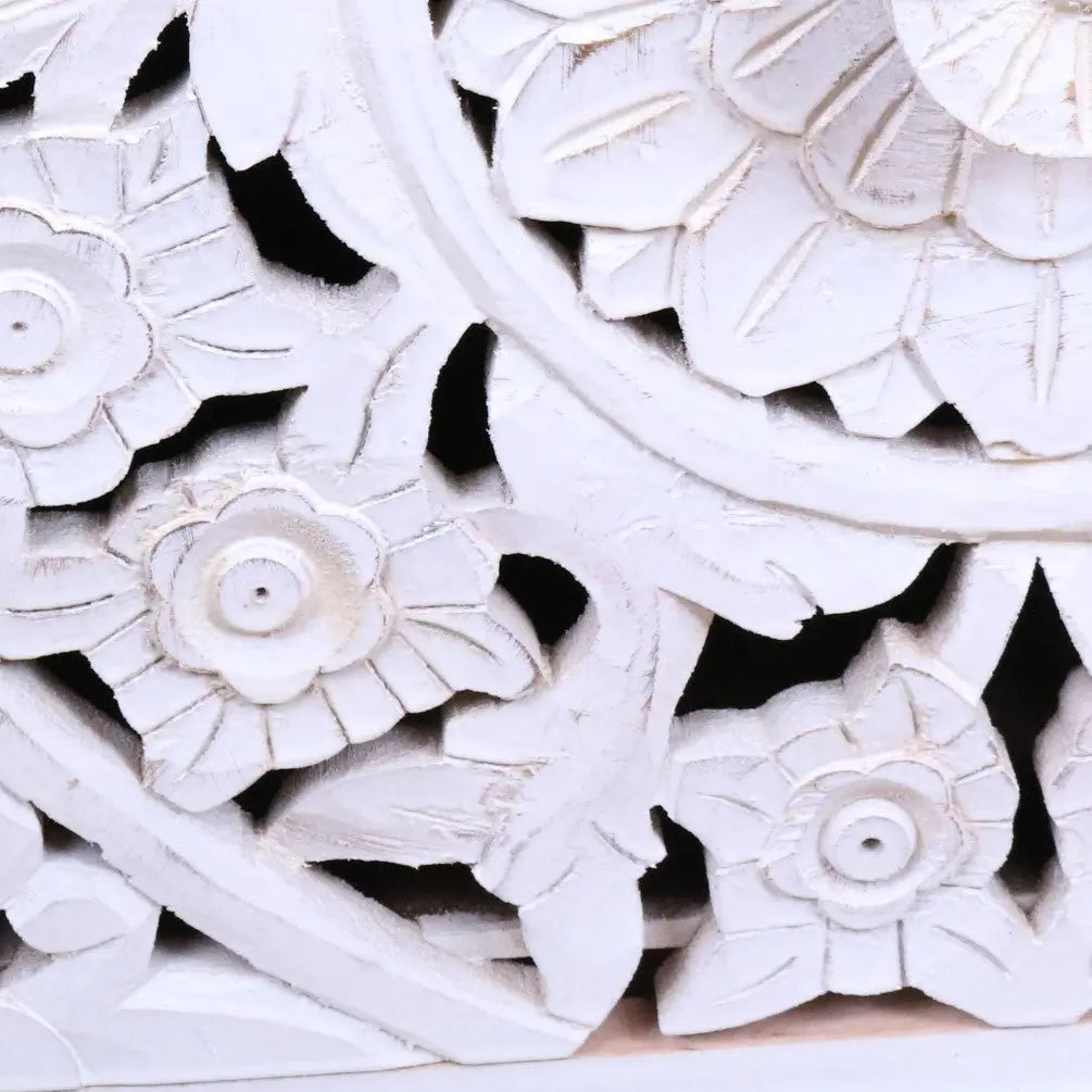 Bring warmth and artistry into your home with the Sohani Wooden Carved Bedside Table. Handcrafted from sustainable mango wood and finished in a soft distressed white, this charming cabinet offers both style and storage. The detailed floral carvings on the drawer front are inspired by traditional Indian motifs, adding cultural richness and texture to your bedroom or living space.