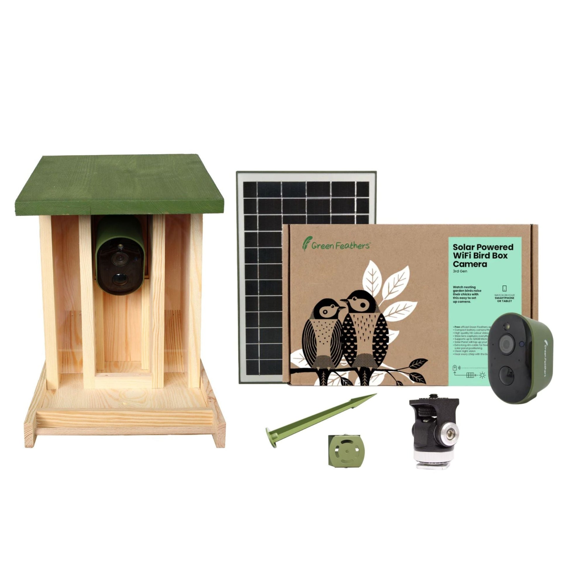 Our wooden bird feeder camera kit made from sustainably sourced wood is compatible with all of our existing cameras. Our newer model cameras also give you the chance to use the Green Feathers app on your smartphone or tablet and watch live or recorded footage. Whether it be from your own camera or a friend/family member. With a wooden build, you benefit from a feeder resistant to harsh weather conditions and UV rays that blends seamlessly into your garden - adding a charming rustic touch whilst making it easier for your feathered friends to perch.