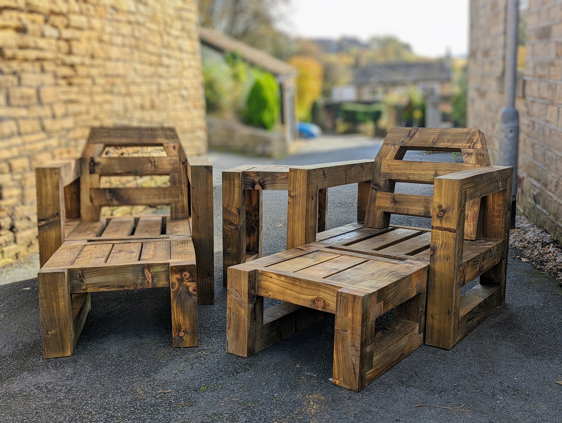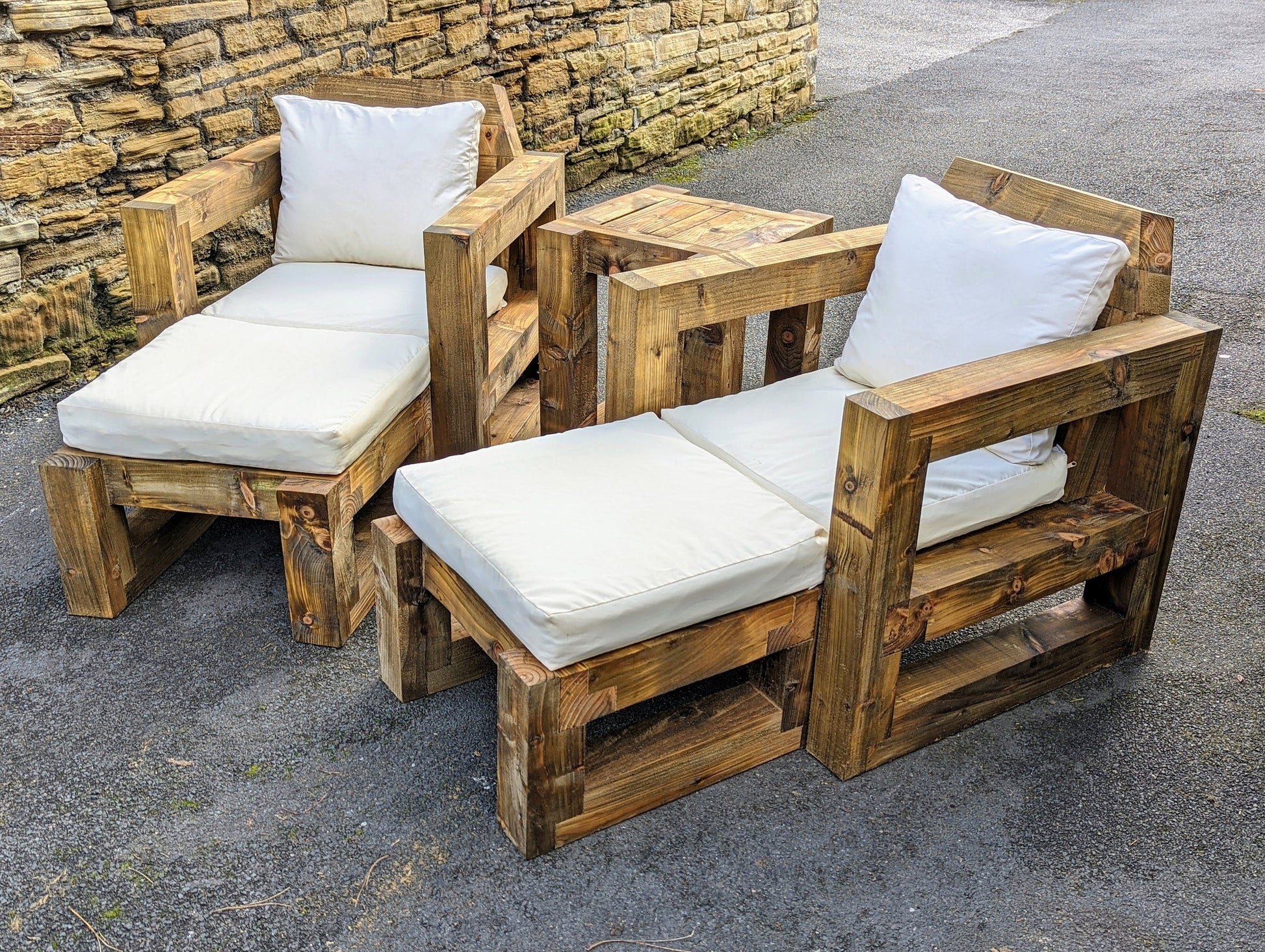 A set of handmade to order rustic Garden chairs built from Pressure Treated Timber that is 100mm x 100mm Thick. This is an incredibly Strong and Industrial Design. Designed using a series of rebate joints that uses the strength of the wood itself to provide rigidity. There are absolutely NO visible screws/Bolts for a simplistic and Minimalist effect. Also included, a side table and 2 ottomans / foot rests that can either be used to convert your chairs into sun loungers or simply used as a coffee table or even an extra stool if you have guests.