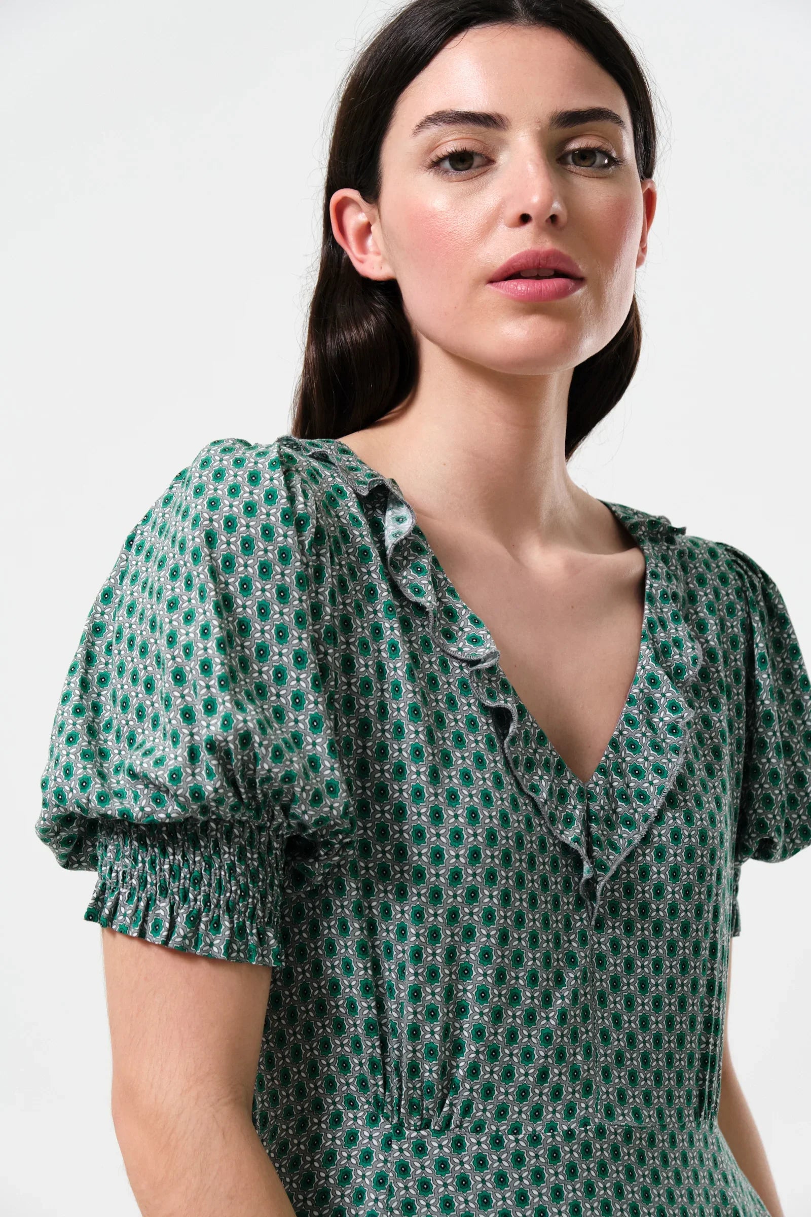 "Adorable and flirty, the Solyne flower tile print mini dress boasts a frill-edged V-neckline, cute puff sleeves and a full flared skirt. Crafted in the most flattering teal-coloured ditsy tile-inspired print. This dress will take you from desk to dinner instantly.
