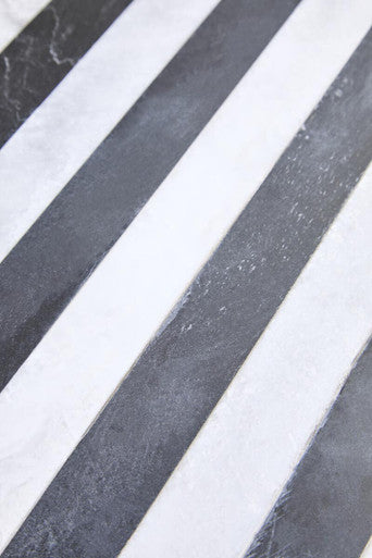 This large cake stand is crafted from a combination of black and white marble, joined to create an elegant striped pattern. A cylindrical pedestal stand supports the round top, ideal to serve and display a variety of desserts on occasions.