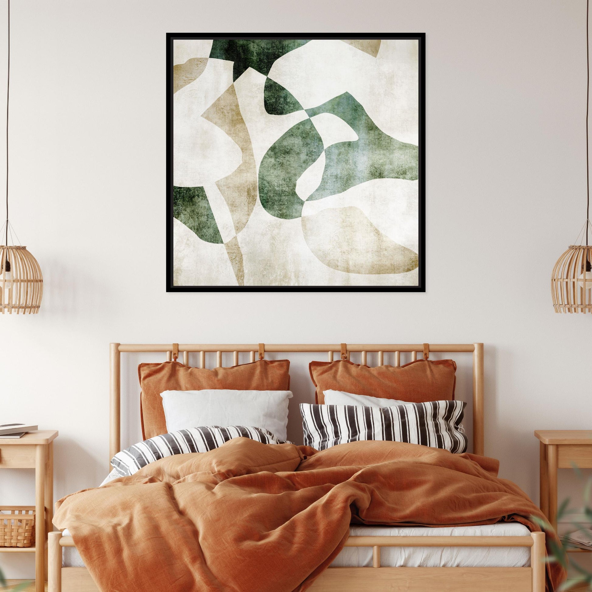Experience the essence of mid-century modern with ‘Soraya’– a captivating art piece adorned with flowing abstract forms in deep tonal greens and beiges, set against a backdrop of white and stone. Let ‘Soraya’ redefine your decor with its dynamic energy and harmonious balance of colour and form.