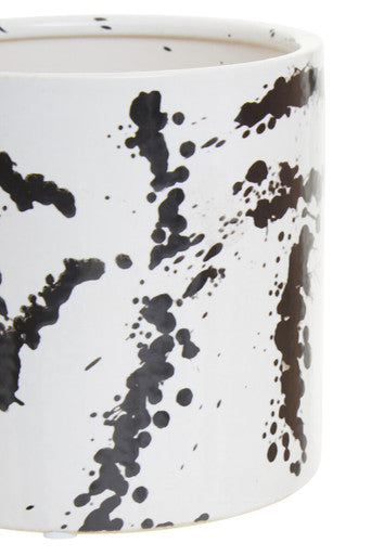 Made from robust ceramic, the Sorrel black and white small planter is an elegant and chic platform for adding a planted pot to your home interiors. The handcrafted round planter has a crisp white finish countered by paint splash effect in black hues creating an artistic accent piece that is equally stylish as a standalone piece of to introduce an organic charm with a verdant plant.