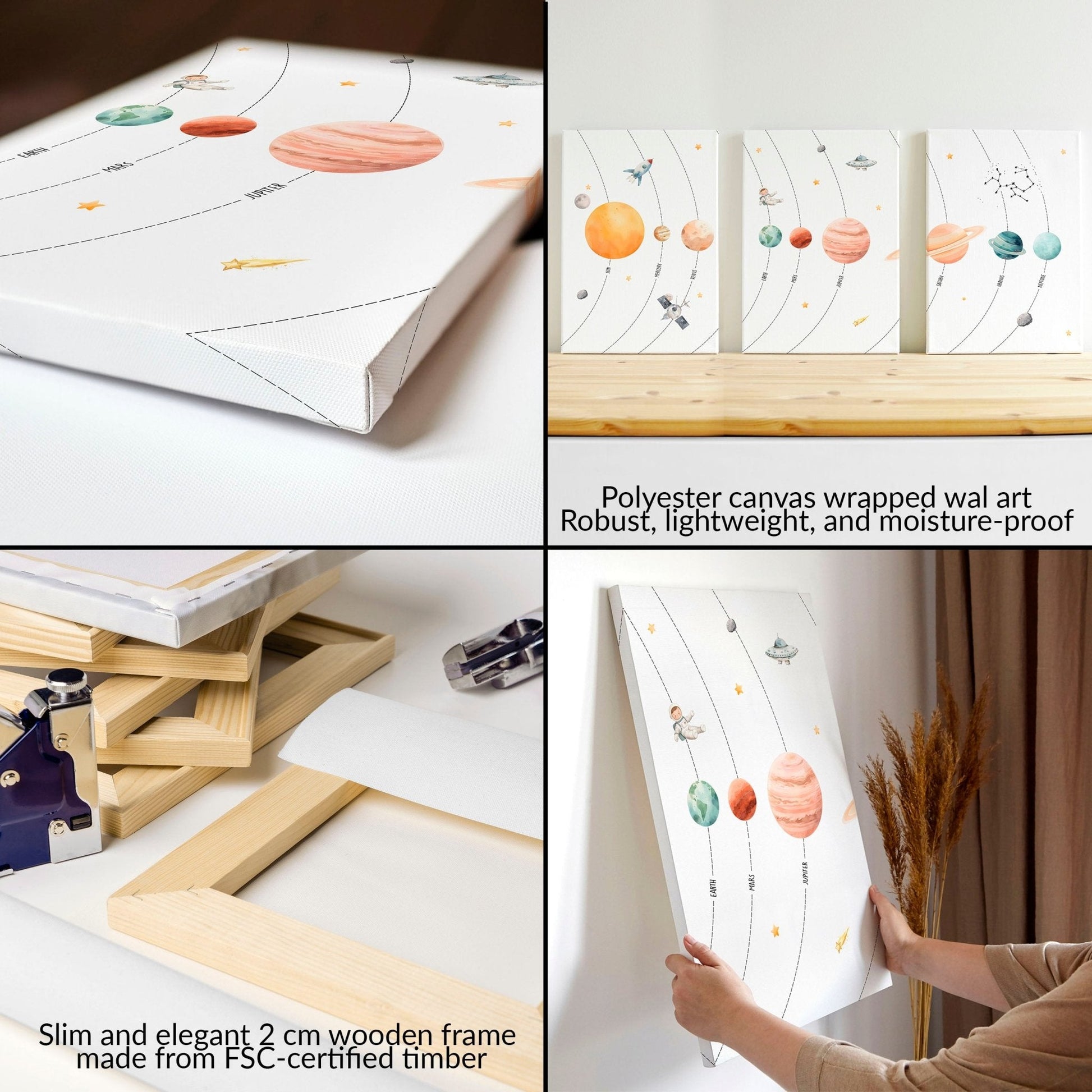 Designed for easy placement and maximum impact, this Set of 3 wall art prints serves as an essential decor element in your Nursery. The awe-inspiring cosmos style sparks curiosity and imagination in young minds, infusing the room with a unique and inviting charm. Act today to secure these Space Posters and elevate your Nursery's decor effortlessly.