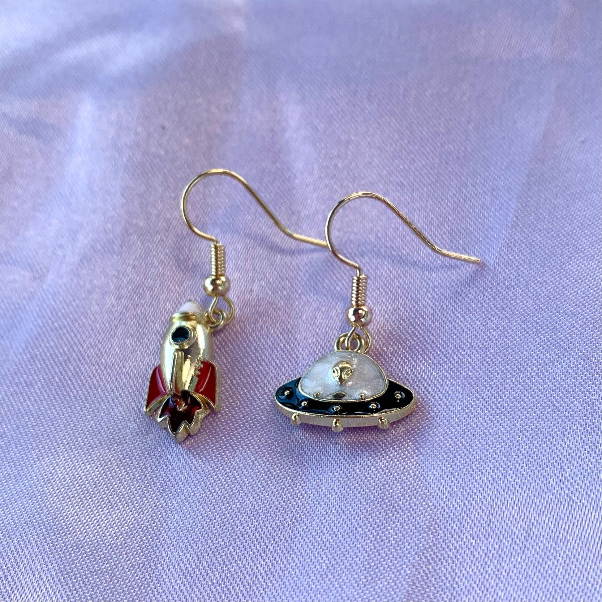 A cool set of space themed alien and rocket ship earrings on 18k gold plated hooks.