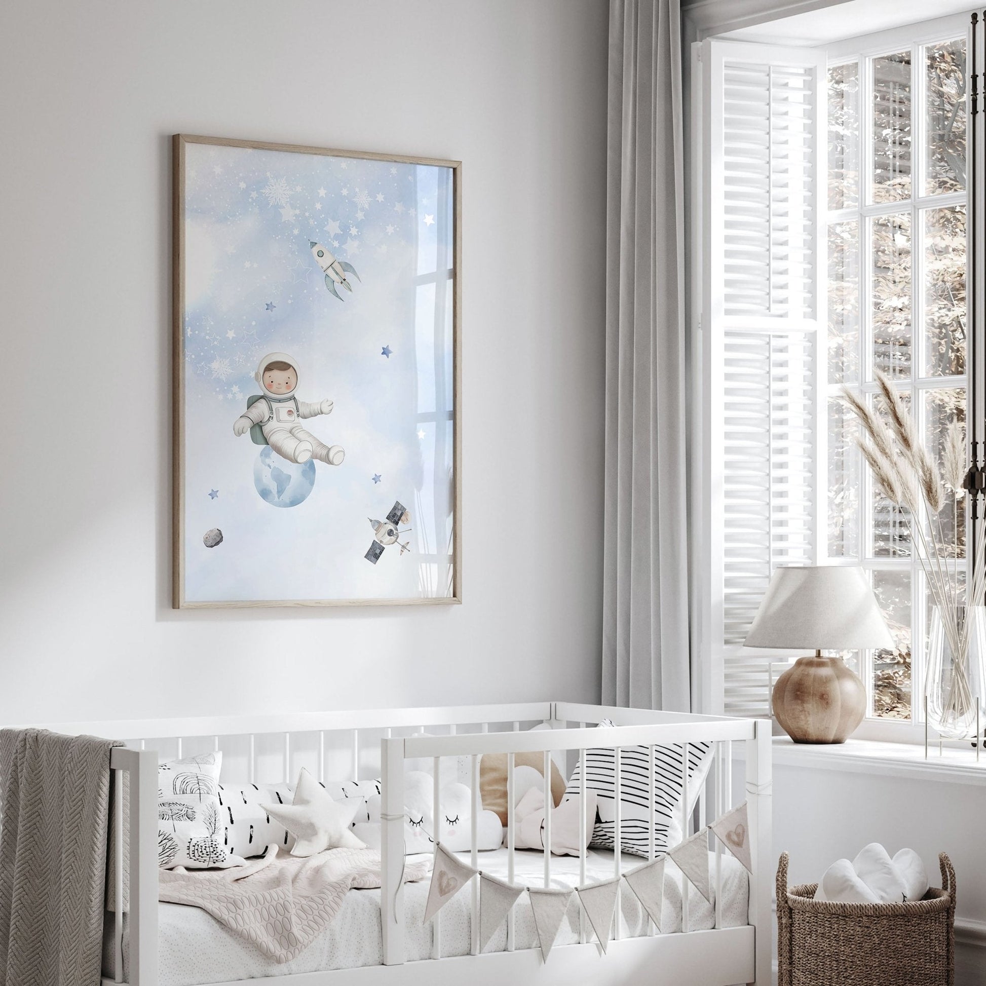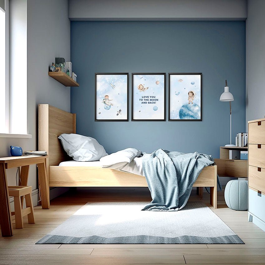 What's truly special about this Space Wall Art is how it transforms an ordinary wall into a canvas that sparks the imagination. With shades of blue evoking the vastness of space, each print certainly provides a serene backdrop that enhances the tranquillity of your nursery.