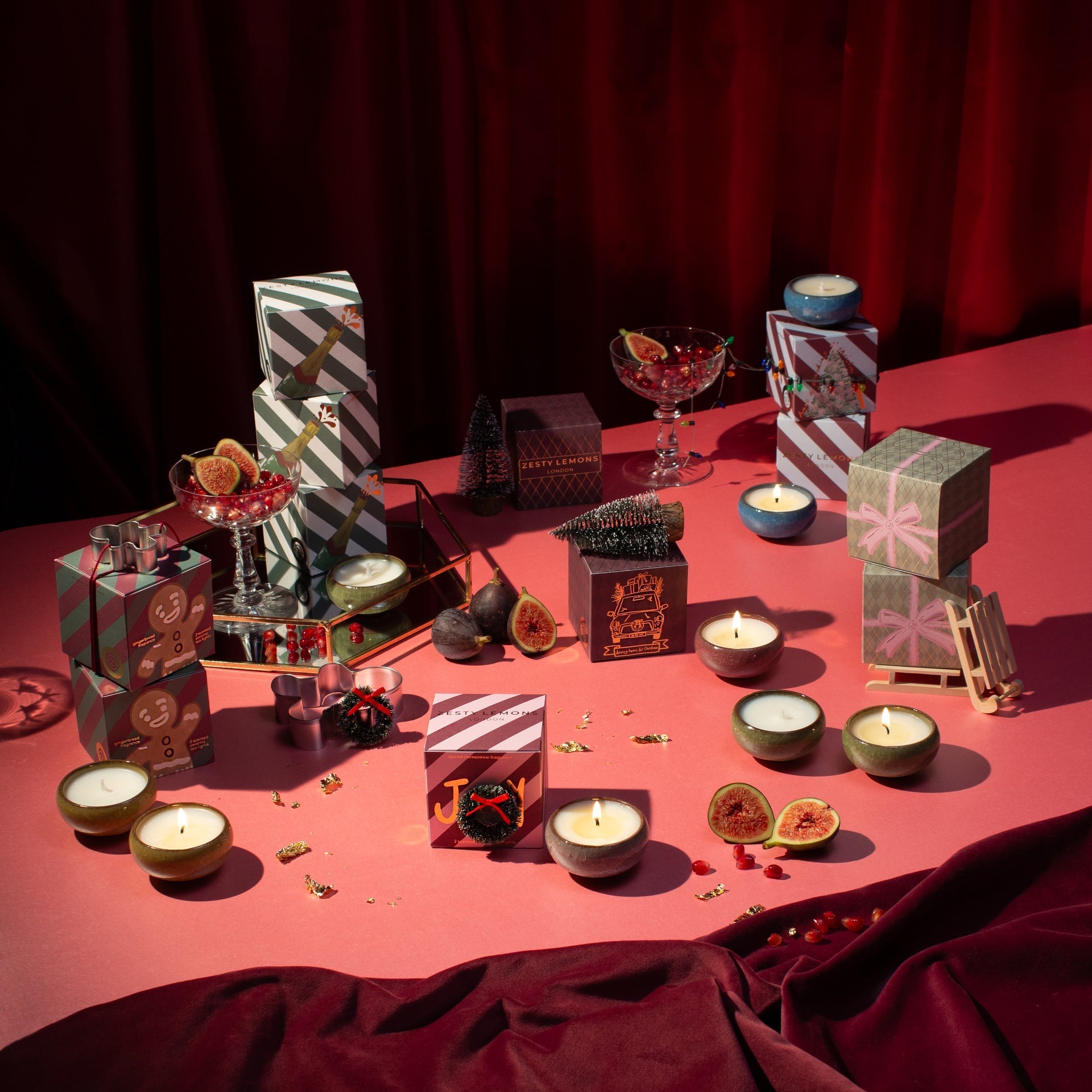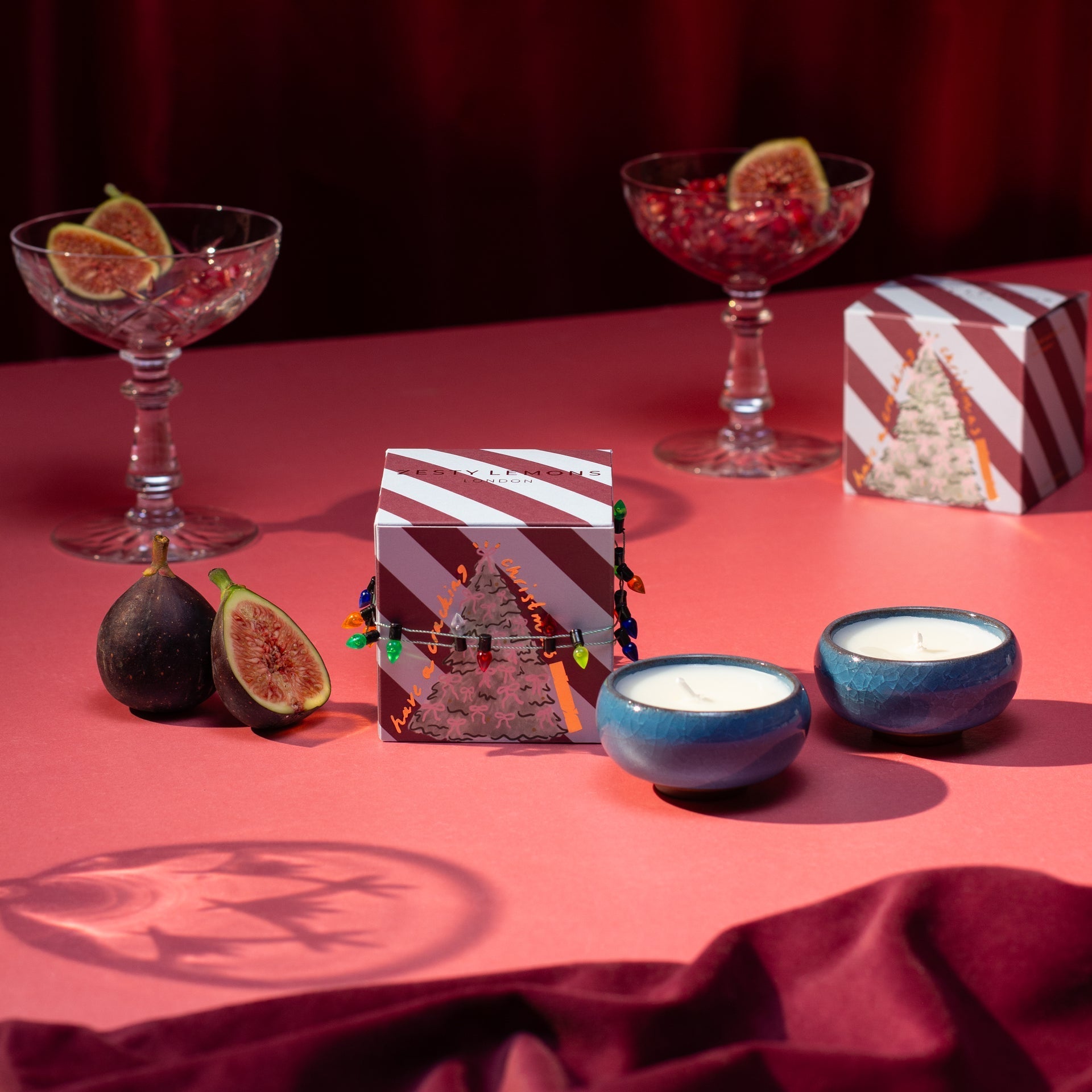 Each box contains two of our best-selling ceramic tea light vessels, filled with a cosy seasonal scent and designed to be repurposed long after the wax is gone. Presented in a playful 3D Christmas-themed gift box, containing artist illustrations and wrapped in a string of Christmas tree lights, it’s a charming keepsake in itself - no wrapping required.