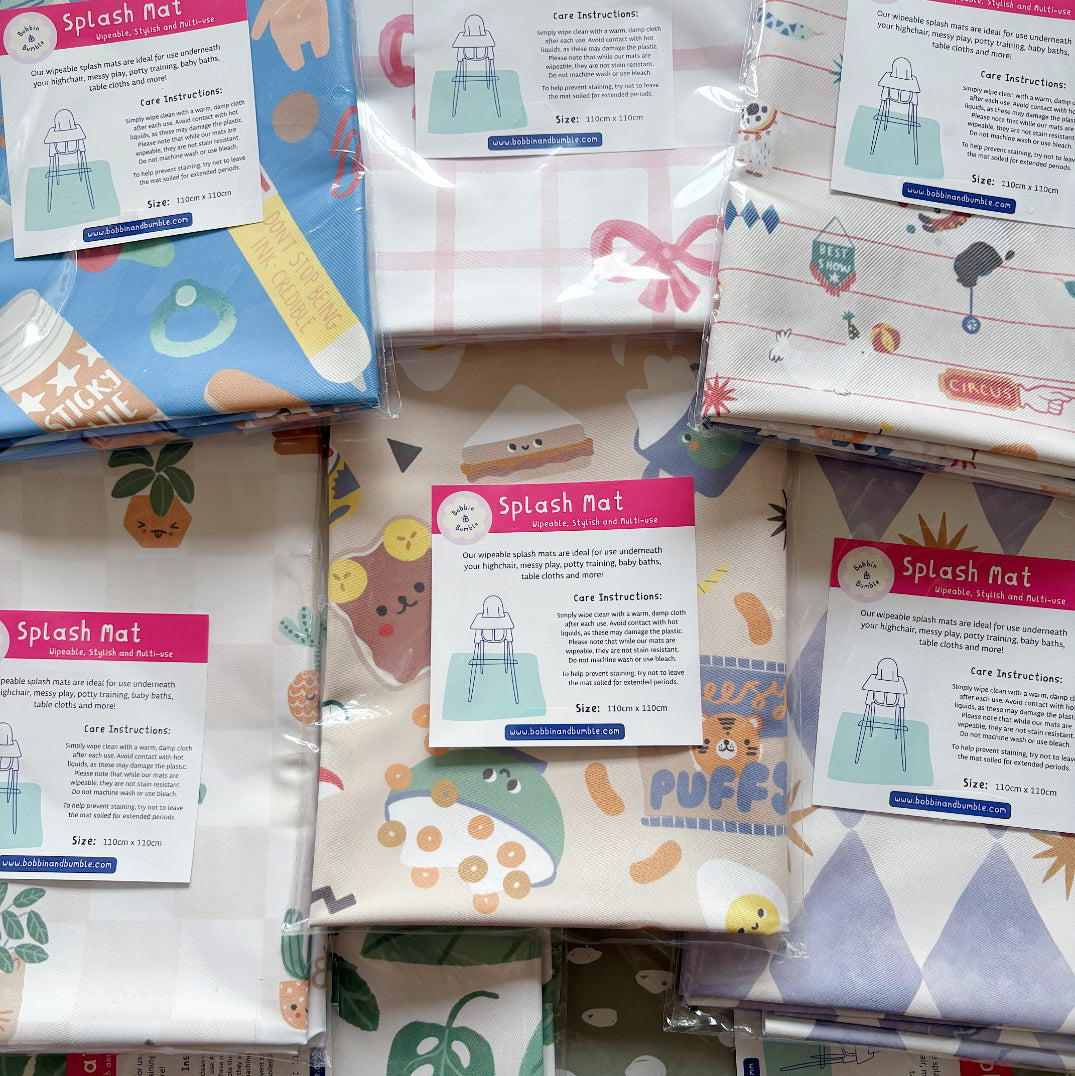 Add a touch of charm to your mealtime setup with our Pink Bows Splash Mat, exclusively designed for Bobbin and Bumble. Featuring delicate gingham checks and oversized pink bows, this adorable print is perfect for modern nurseries and stylish weaning setups.