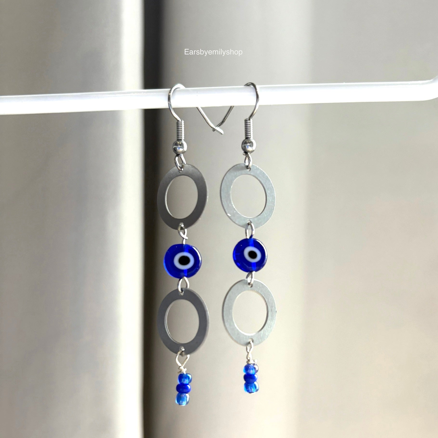 Stainless steel circle and blue evil eye bead statement dangle earrings