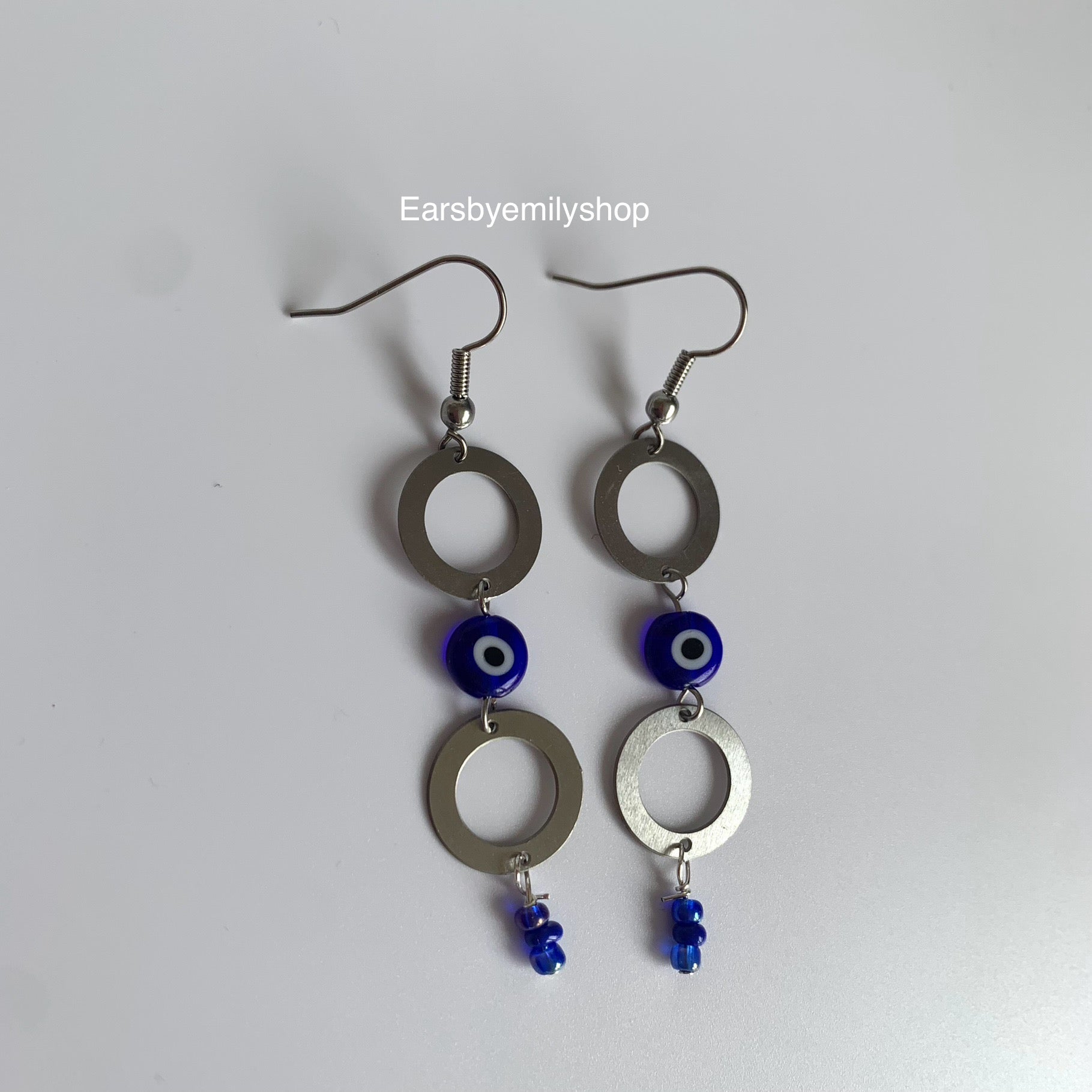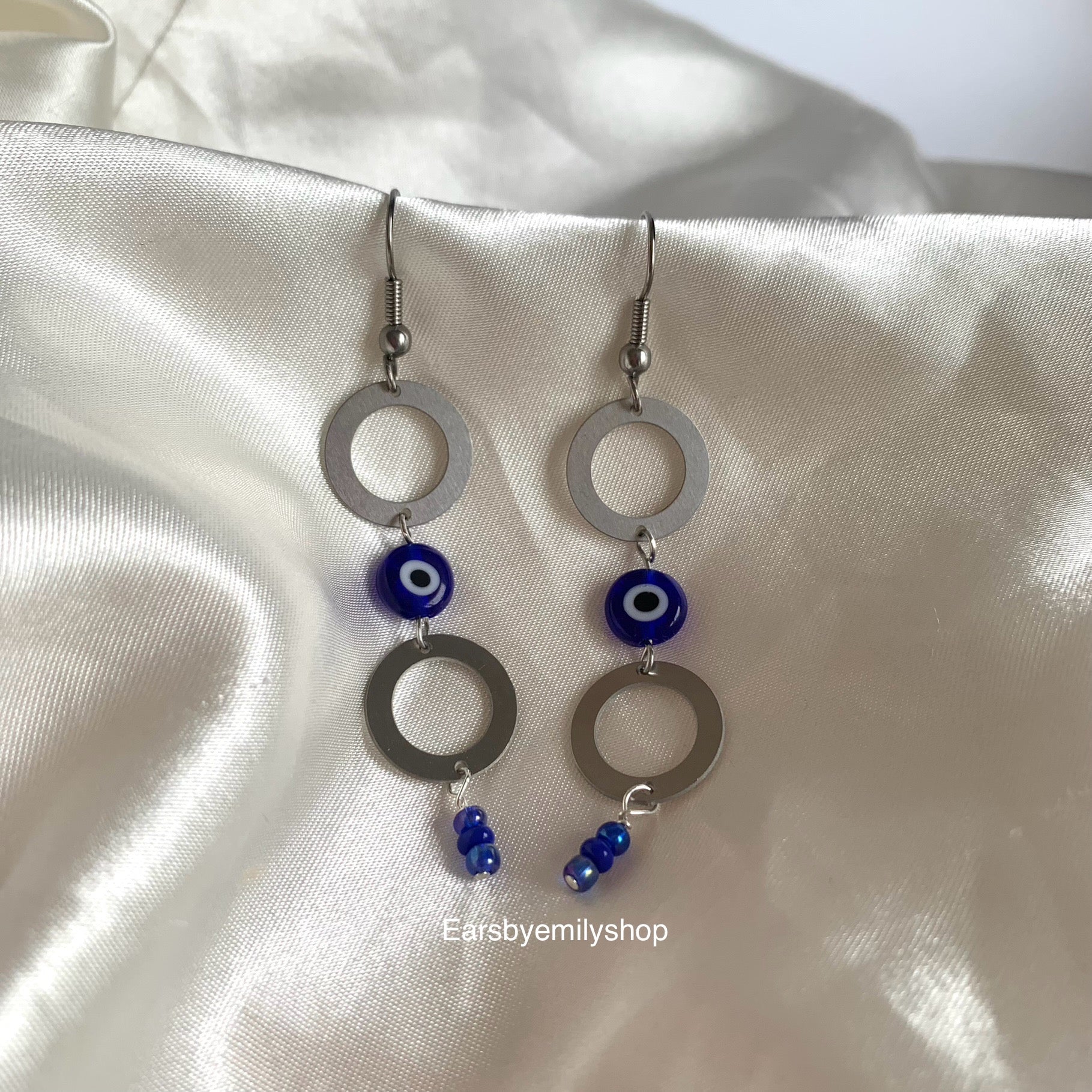 A cool pair of handmade stainless steel circle with blue evil eye bead earrings on hypoallergenic surgical steel hooks.