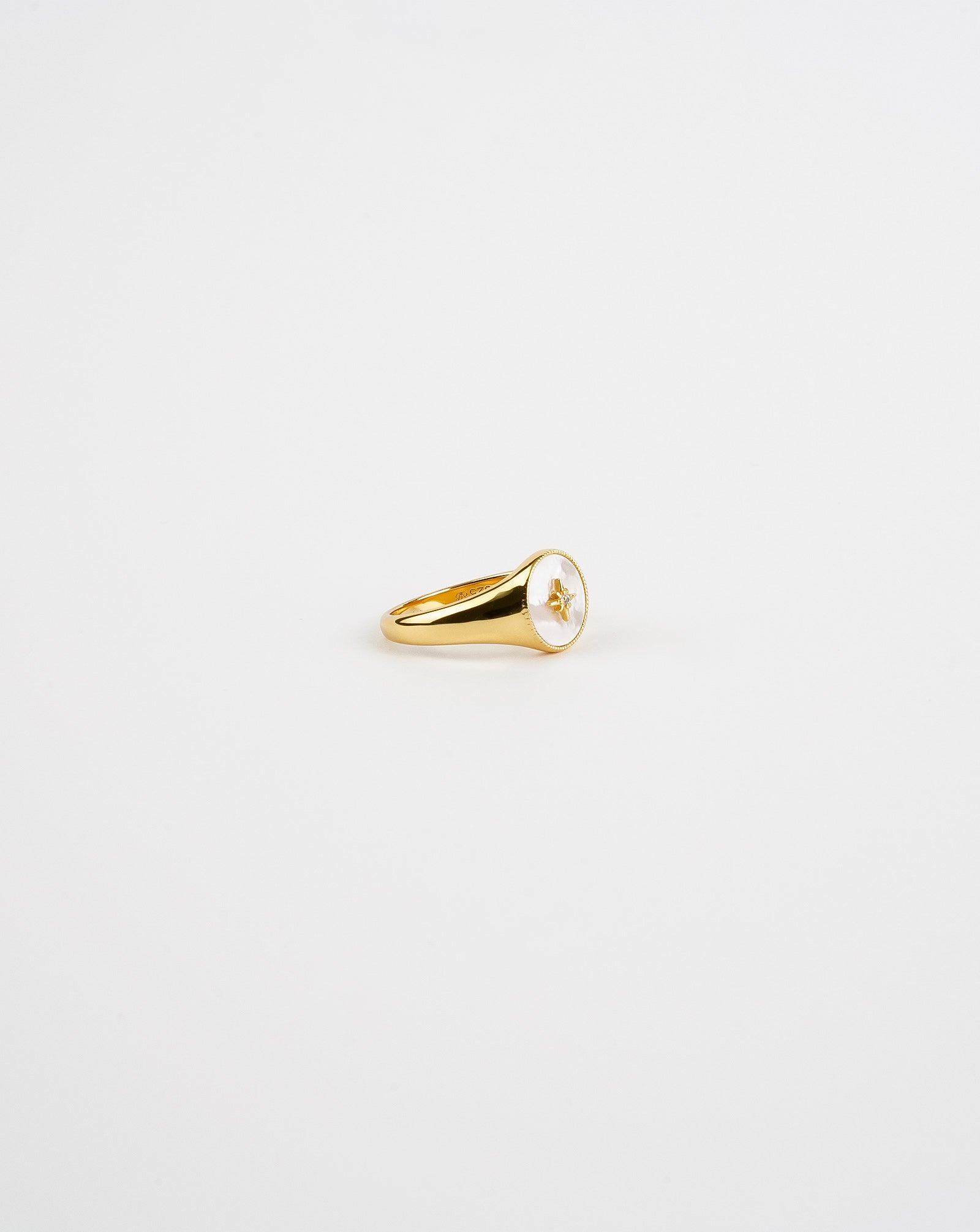 Indulge in understated elegance with our Star Mother of Pearl Ring. This stunning piece features a lustrous mother of pearl inlay, reminiscent of a star shining in the night sky. Crafted with the finest materials, this ring is a sophisticated and exclusive addition to any jewellery collection.