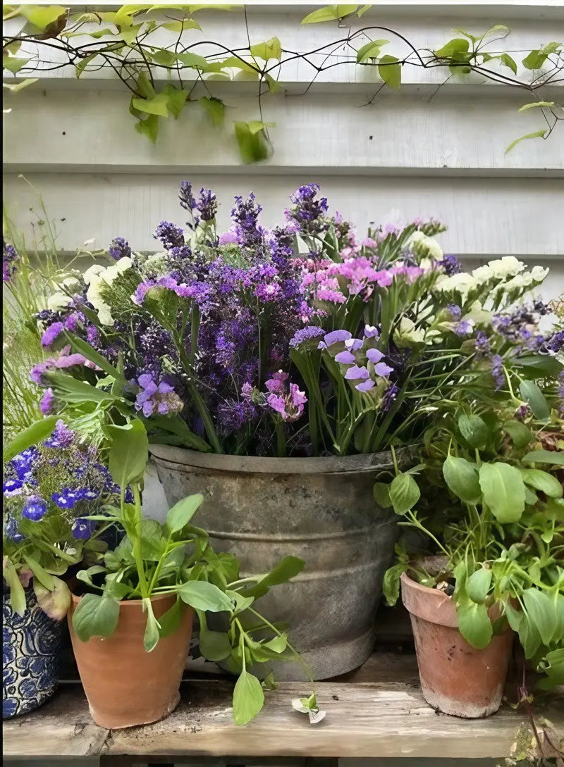 - ☁️ Ageratum 'Timeless Mix': The Texture Balance. The soft, fuzzy "powder puffs" of Ageratum provide a stunning foil to the sharp, papery structure of the Statice. Together, they create a sophisticated textural display in summer bouquets.