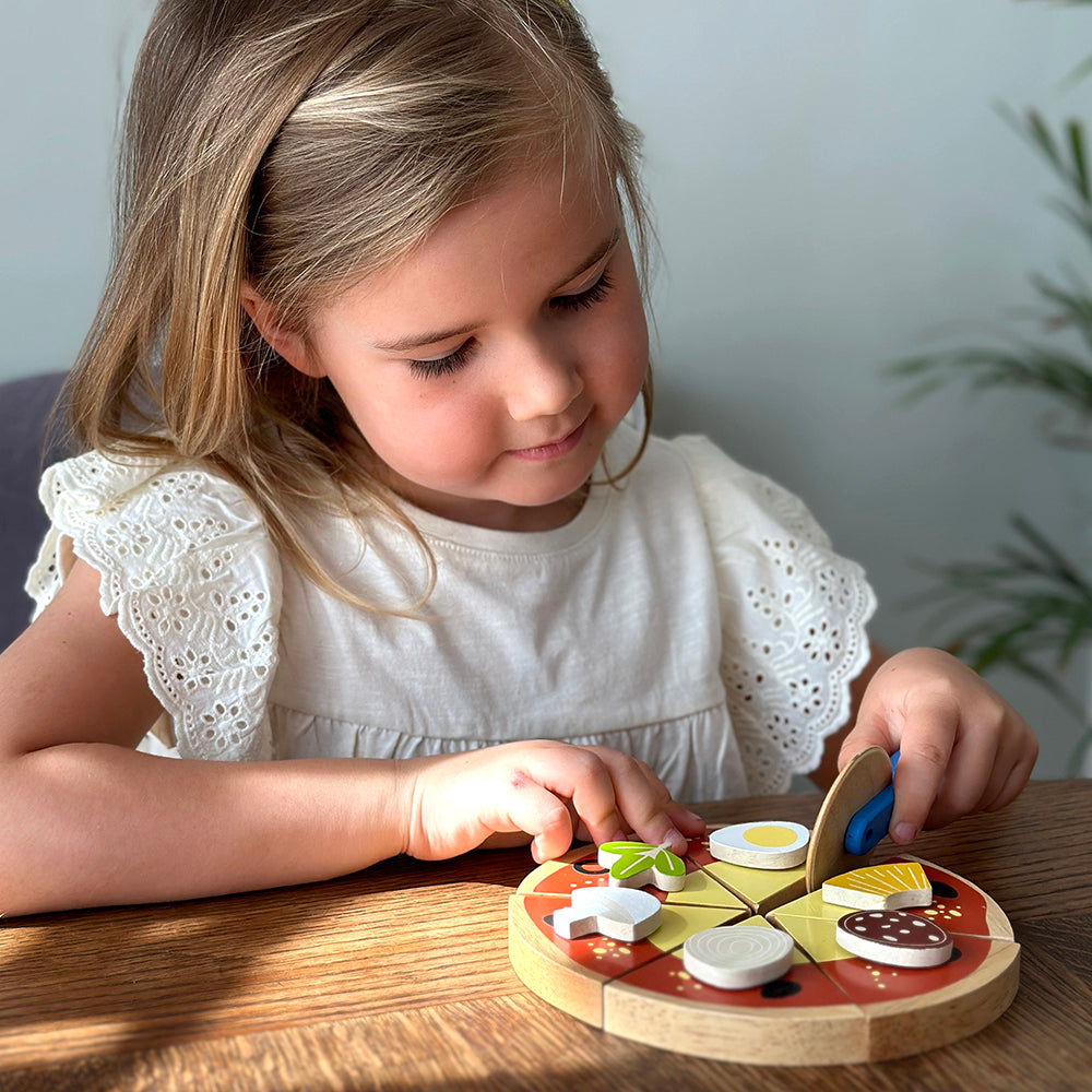 A sliceable 6-portion wooden pizza toy attached together with velcro. There is a rotary pizza slice and 6 different toppings to attach to the pizza with velcro spots.