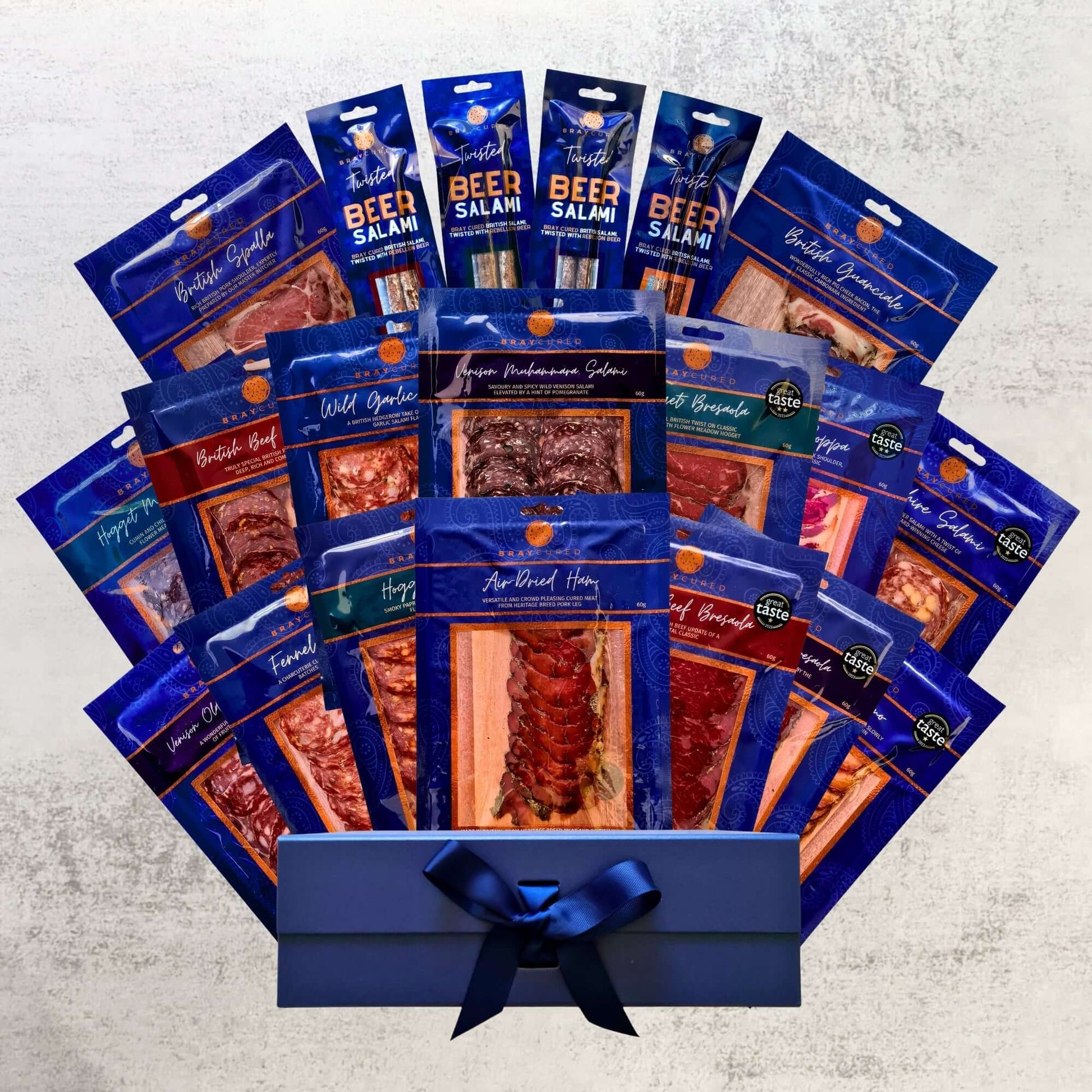 Gift the ultimate charcuterie treat to a foodie in the know. A mix of five, ten or twenty packs of our cured meats from our range, which includes sliced salamis and cured joints, award-winners, 'ndujas and spreadable salamis. Everything in the selection is small batch, hand made and created from British heritage breed meat and local wine.
