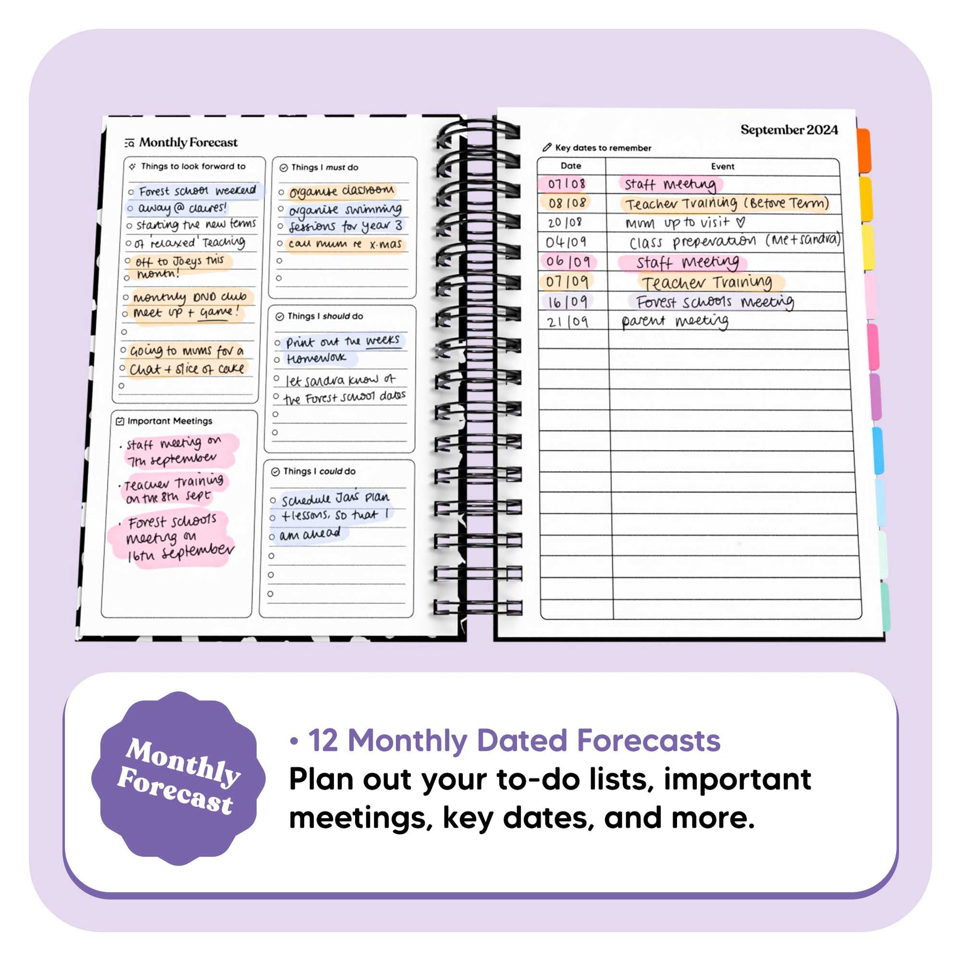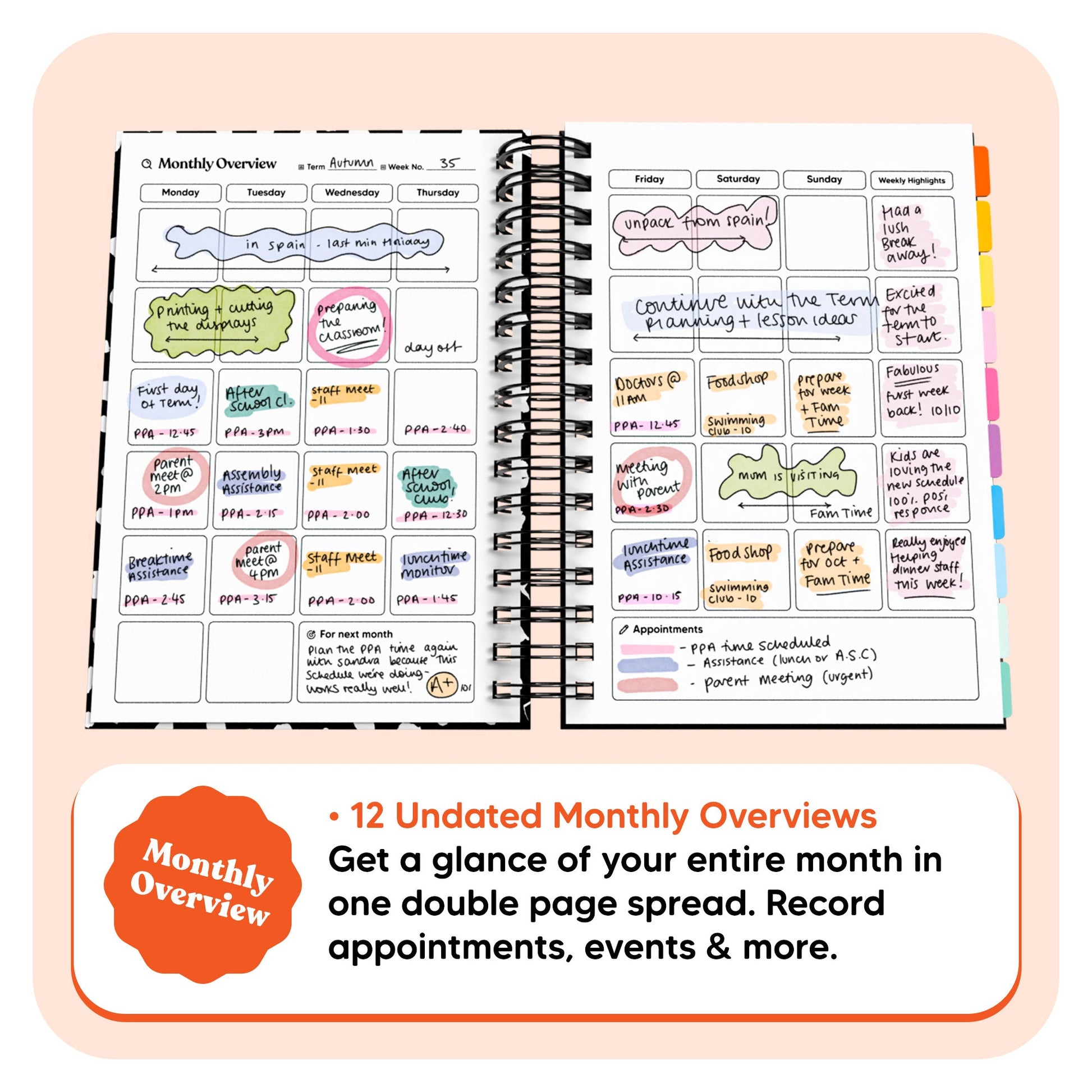 Organise your academic life with our quirky and fun Undated Teacher Journal. This journal is perfect for tracking deadlines, appointments, assignments, and homework. Stay on top of it all with this highly functional and playful journal. Start and stop whenever you need thanks to the undated design - miss a day, or week? no pressure, there's nothing wasted.