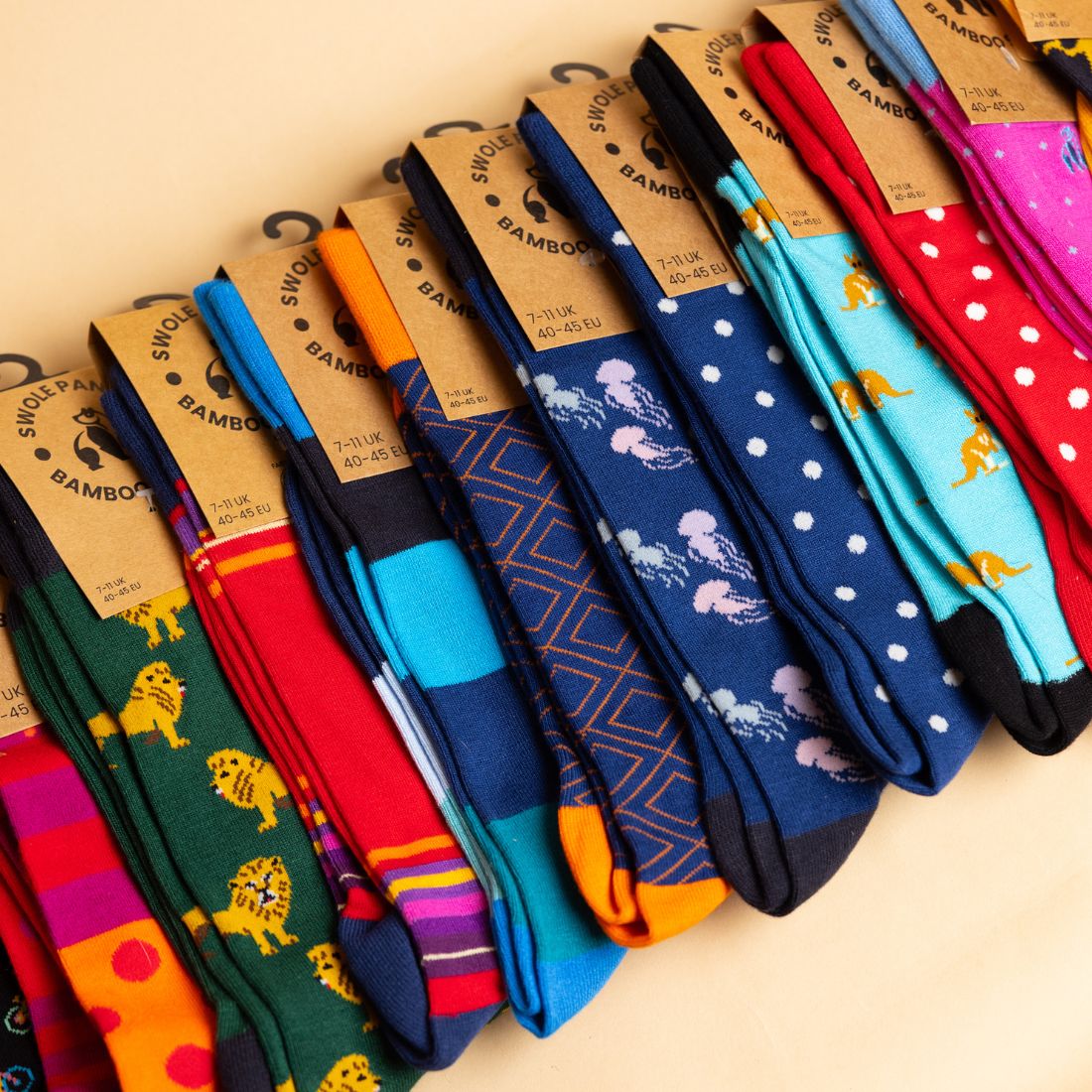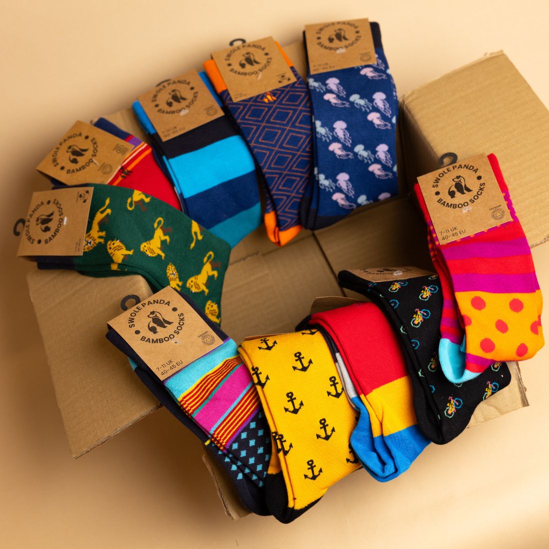 Receive a mystery box filled with 10 or 20 pairs bamboo socks from Swole Panda. These socks are the same material, quality and size that you're used to. There are a few things to note: