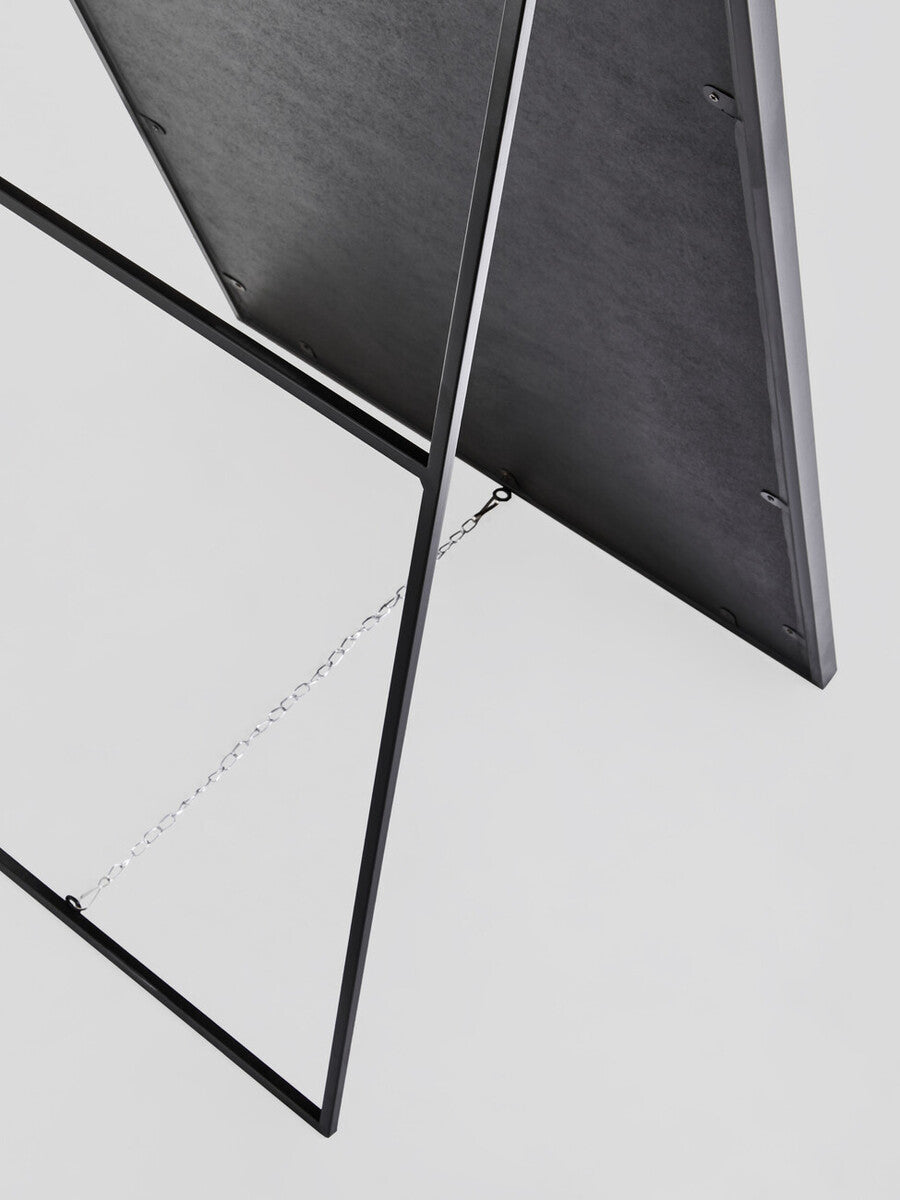 This tall matte black frame floor standing mirror is a stylish and elegant decor piece that will brighten up your space. Made of metal and glass, the mirror can be placed on the floor or lean against the wall. This floor standing mirror will add a touch of sophistication to any home with its reflective glass and mosaic inspired edges made of rectangular glass pieces.