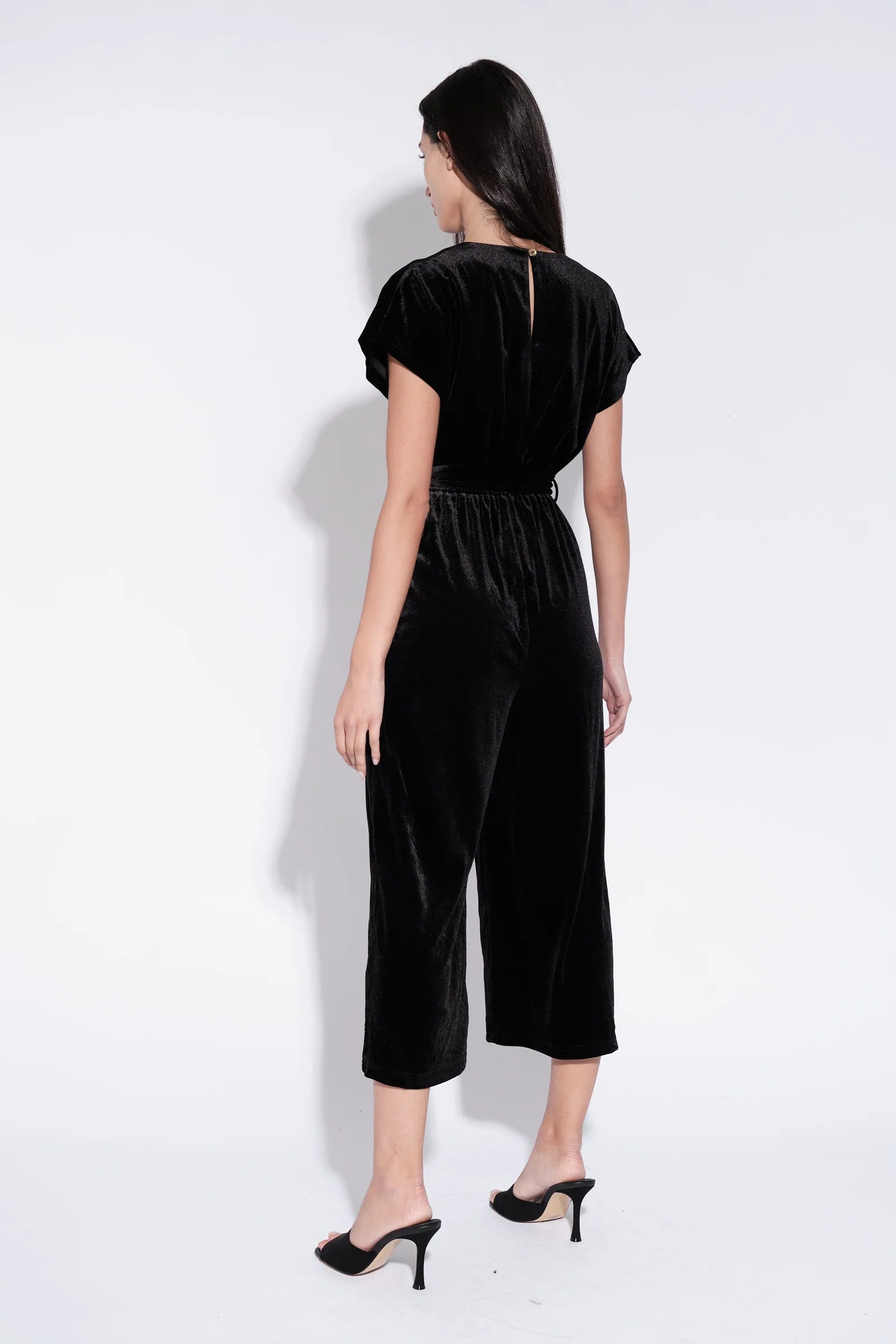 Command attention in the Tiffany velvet jumpsuit. Its flattering wrap bodice, extended shoulder, and cropped leg design is crafted from luxurious black velvet, offering maximum comfort and style. The self-tie belt adjusts size easily and pockets, they just have to be there, perfect for special occasions.