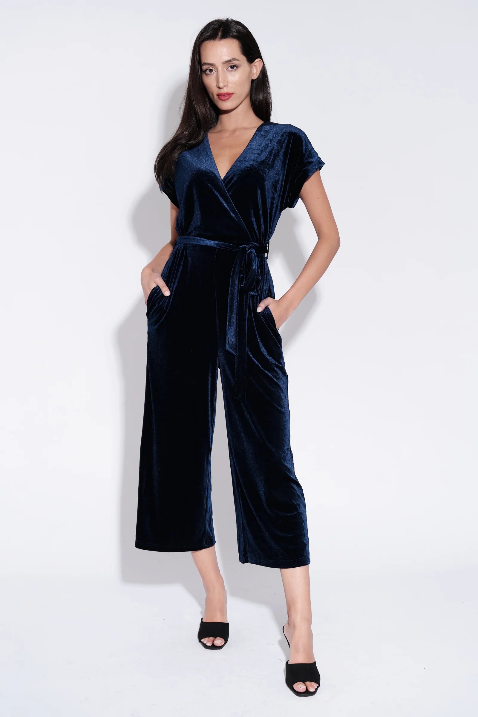 Command attention in the Tiffany velvet jumpsuit. Its flattering wrap bodice, extended shoulder, and cropped leg design is crafted from midnight blue velvet, offering maximum comfort and style. The self-tie belt adjusts size easily and pockets, they just have to be there, perfect for special occasions.