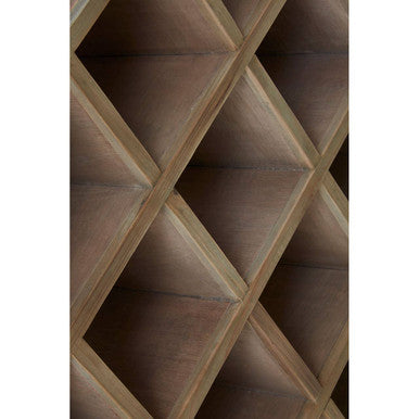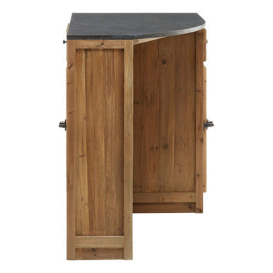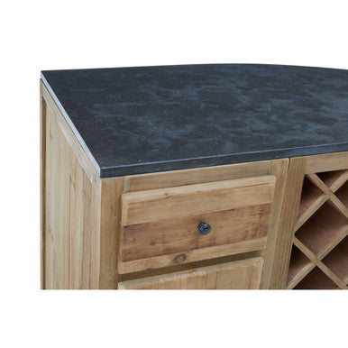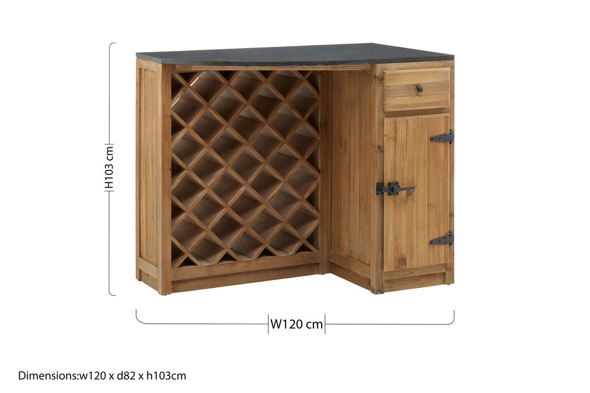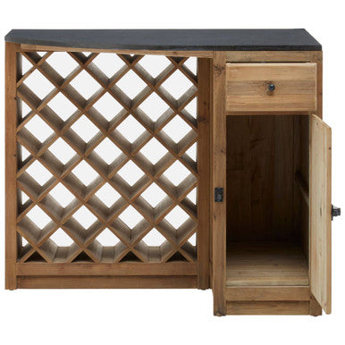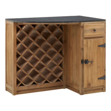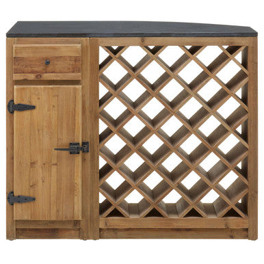 This bar island has a rustic feel thanks to the use of recycled pine wood and distressed metal. It features a large wine rack with a cupboard and drawer adjacent.