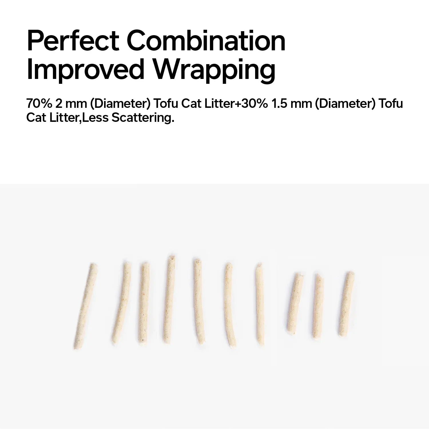 70% Tofu Cat Litter with a diameter of 2 mm + 30% Tofu Cat Litter with a diameter of 1.5 mm. The perfect combination for reducedĀ tracking and improved coverage.