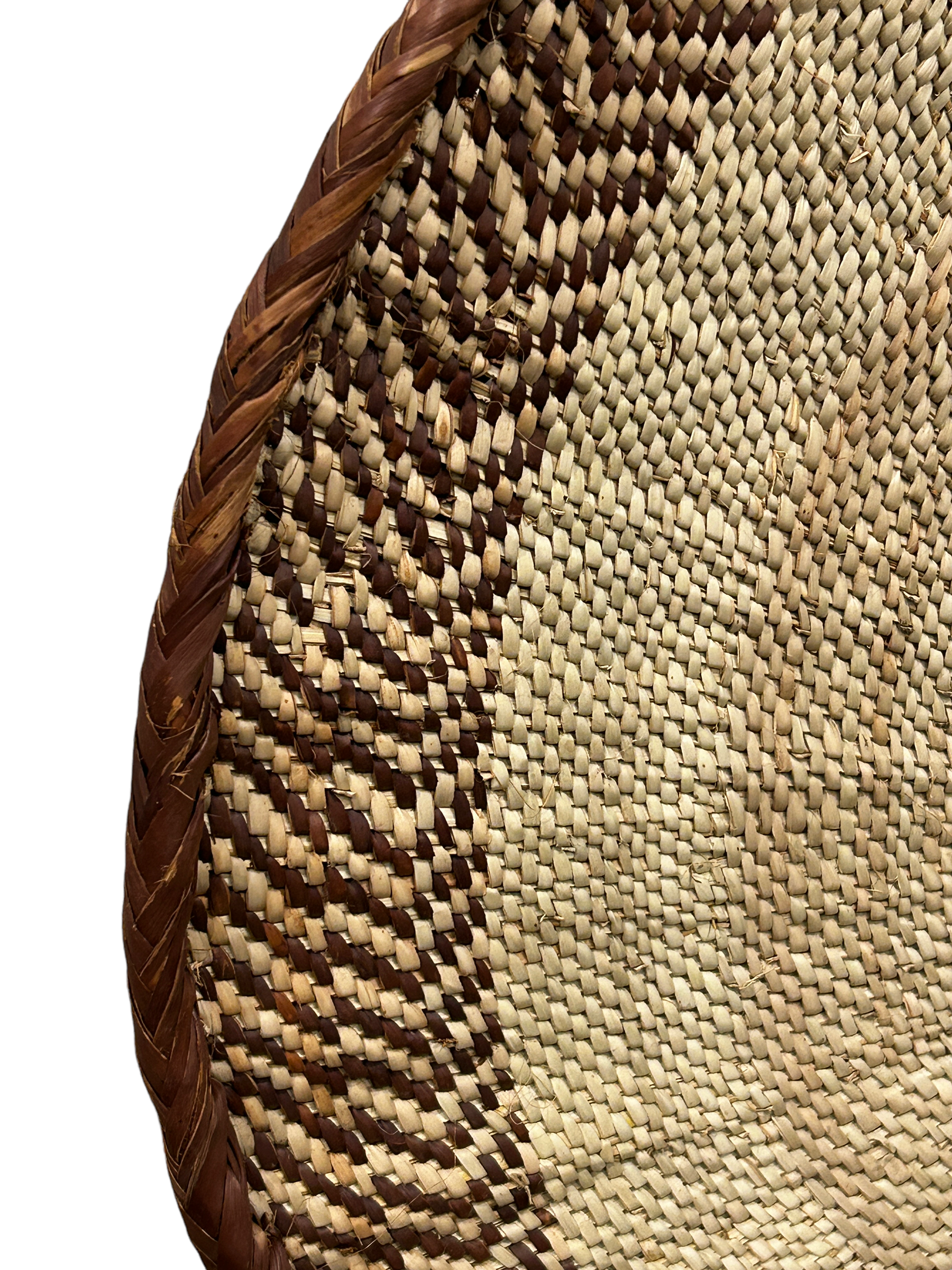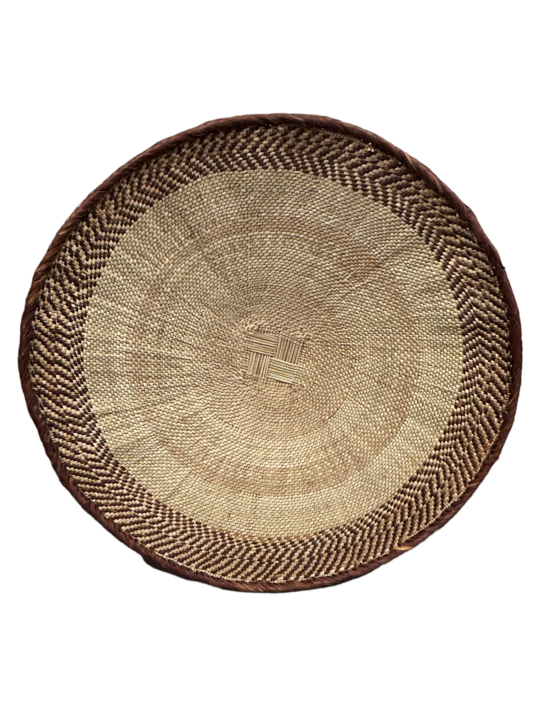 These solid-edged baskets are the apex of the Bathonga people basket maker’s art in Zimbabwe and Southern Zambia. The baskets made from the Ilala palm leaf start as a woven square and end up almost perfectly round. The pattern on the edging is referred to as “snake’s belly”, as the pattern resembles the scales of a serpent. Palm fibres are died using tree bark to make fibres with different colours. The design is very functional, as the baskets are used to winnow grain even today. The baskets are sometimes called “grandmother