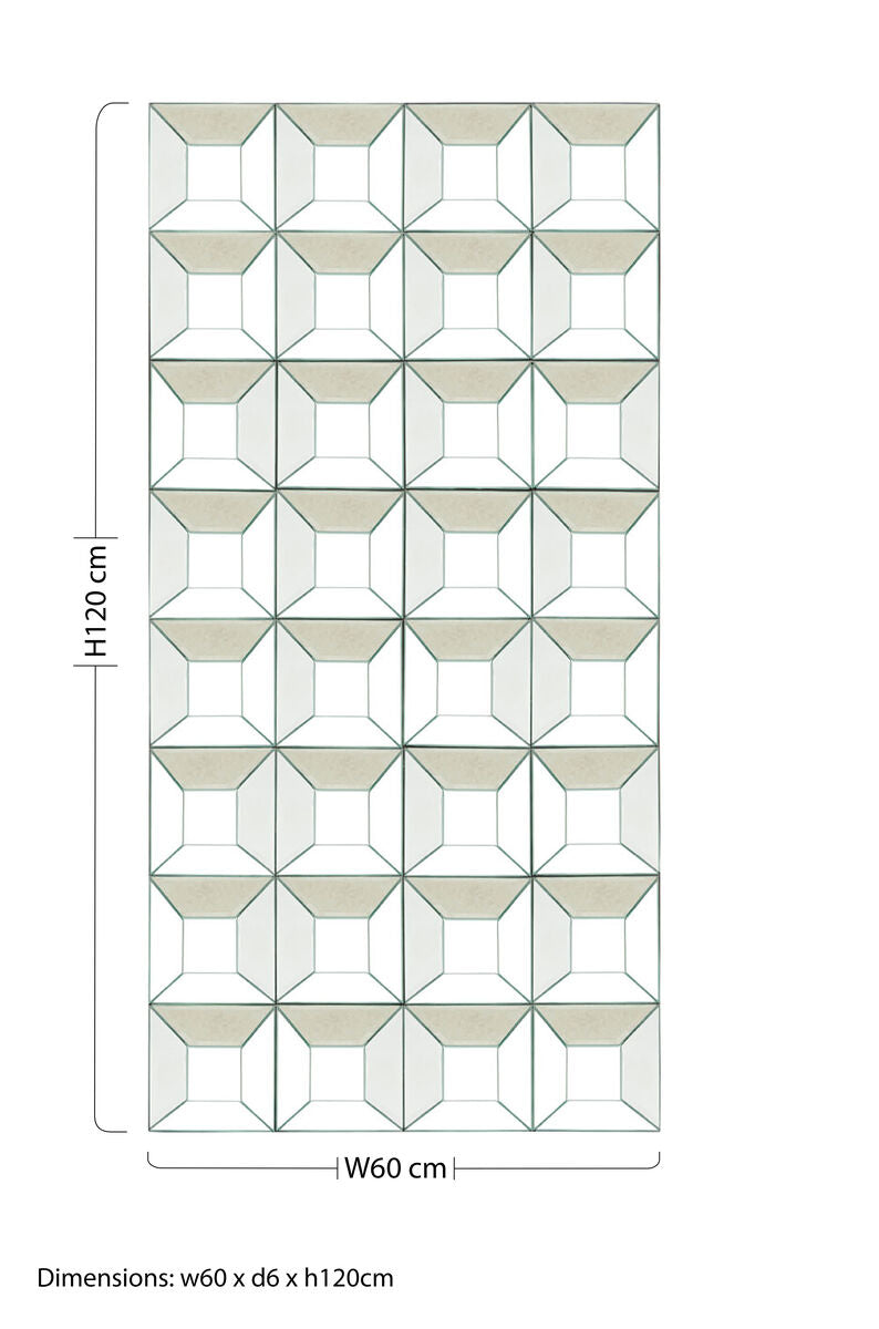 Viewed head-on, the underlying support visually disappears, allowing the grid of reflective panels to take centre stage. The result is a clean, architectural aesthetic that suits modern and transitional rooms.