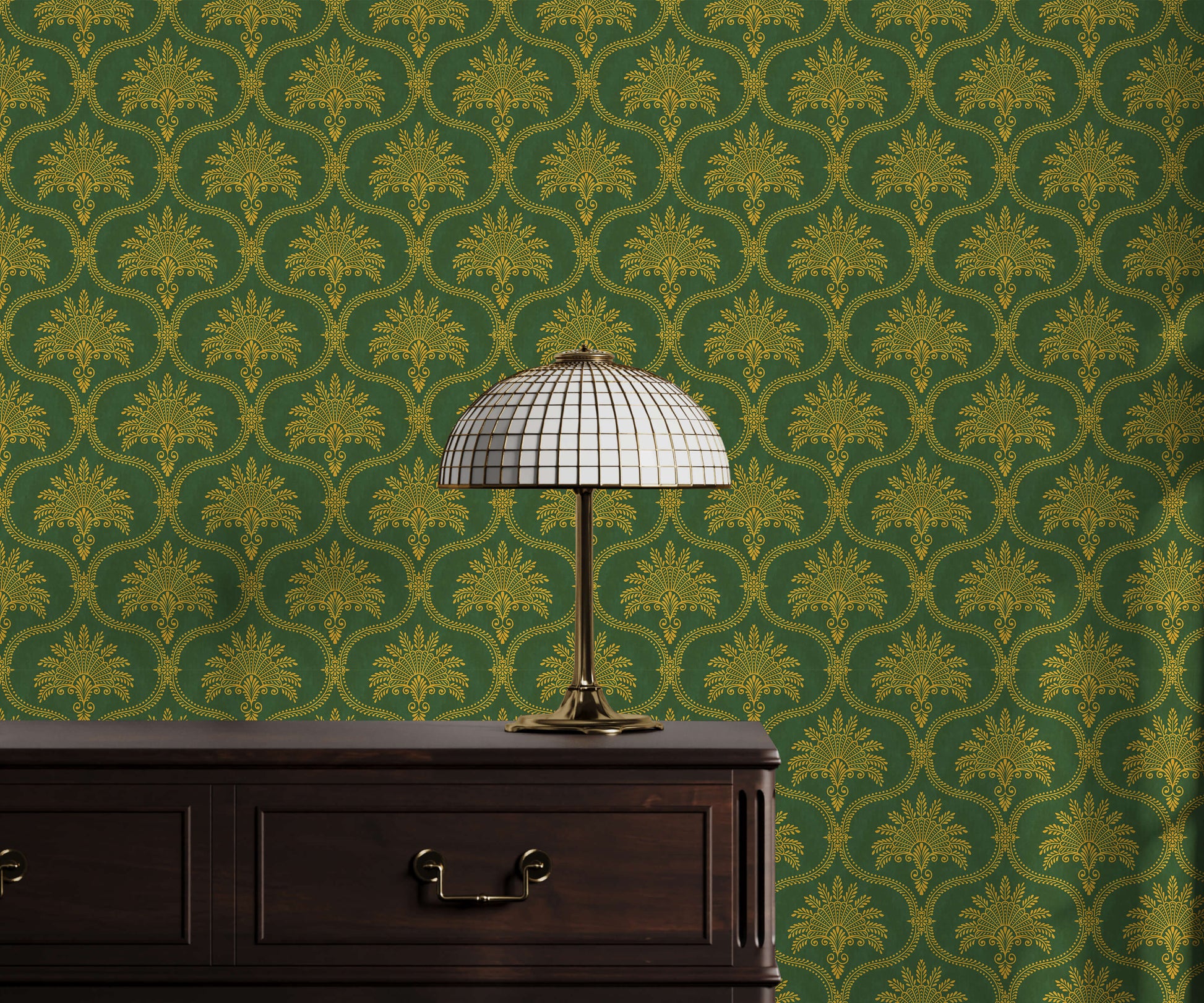 The vintage ornamental wallpaper is a rich and intricate design that immediately adds a feeling of historical luxury and deep texture to a room. The pattern features a continuous ogee framework, within which sits a detailed, fan-like motif created using delicate dots and stylized foliage. This elaborate, repeating structure creates a strong, all-over tapestry effect.