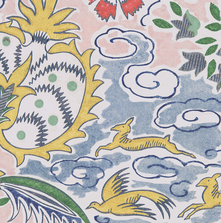This vintage French textile design originally created in 1929 is truly alive with symbolism & good fortune. This wallpaper illustrating nature’s playground, decorates the tree of life motif with an abundance of pomegranates, flowers, animals & clouds.