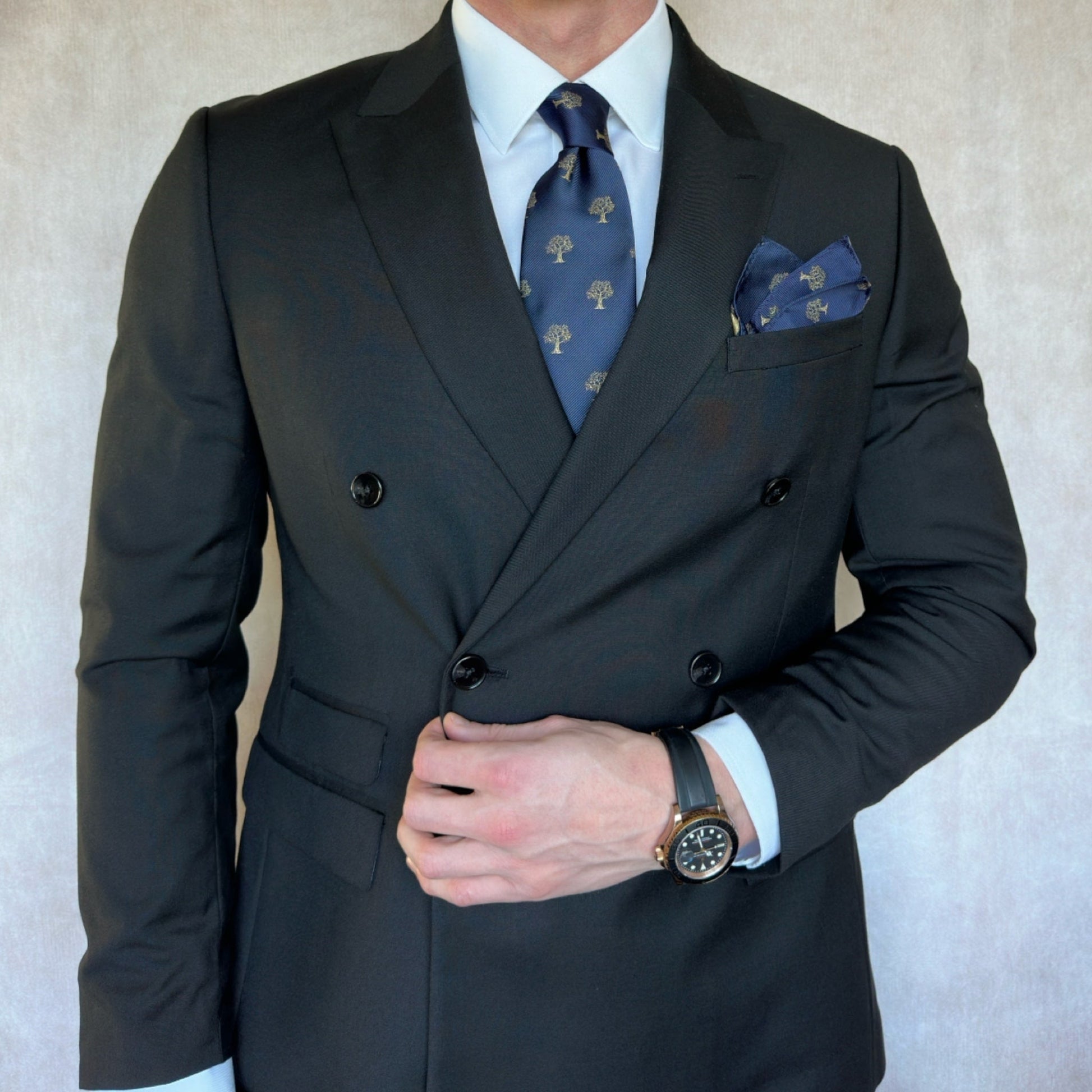 This stunning pocket square features an intricate gold design of branches and leaves climbing up the navy blue fabric. With a blend of luxury and tradition, its timeless aesthetic makes it an ideal addition for formal or business attire.