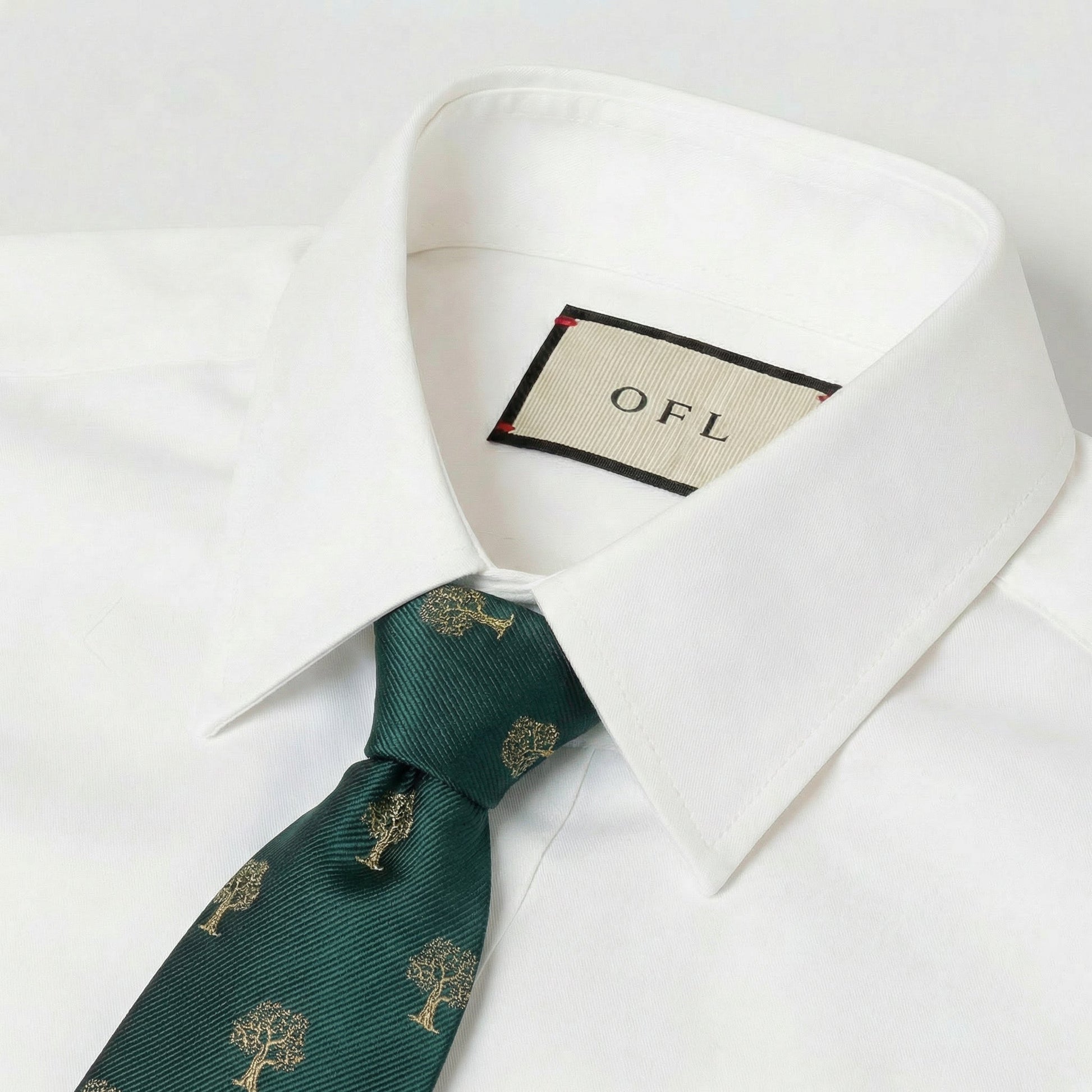 This elegant tie features an intricate design of trees crafted with emerald green and golden threads. Crisp and regal, Its luxuriant embroidery adorn a sumptuous beauty of golden woodland. Elevate your look with this exquisite necktie.