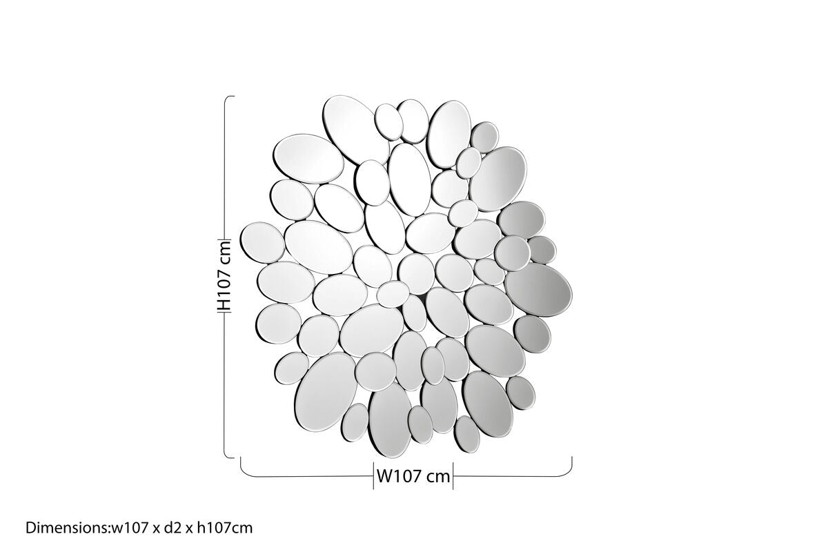 The larger mirrors are arranged at the outer edges, creating a dynamic effect. Forming a circular shape on the wall, each segment features bevelled edges, encouraging light to refract off of their angled surface.