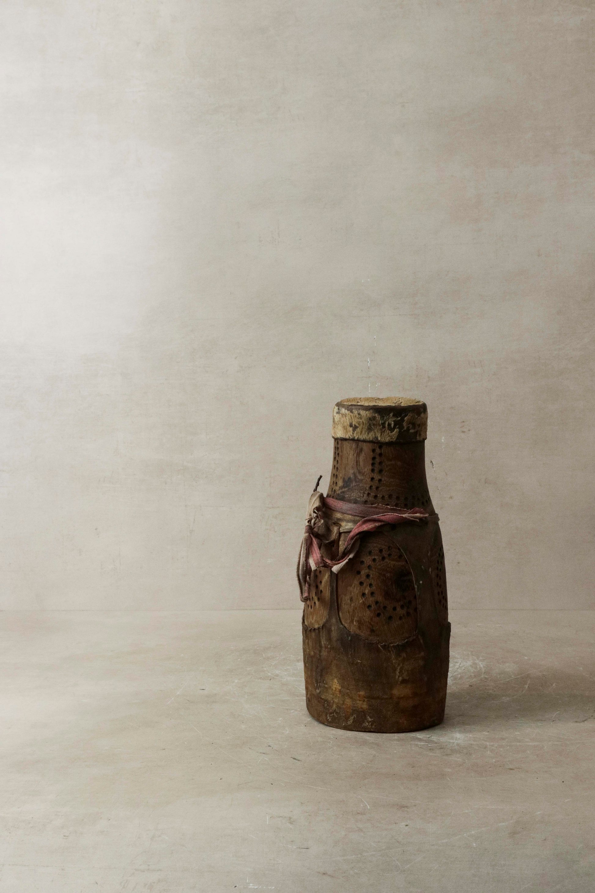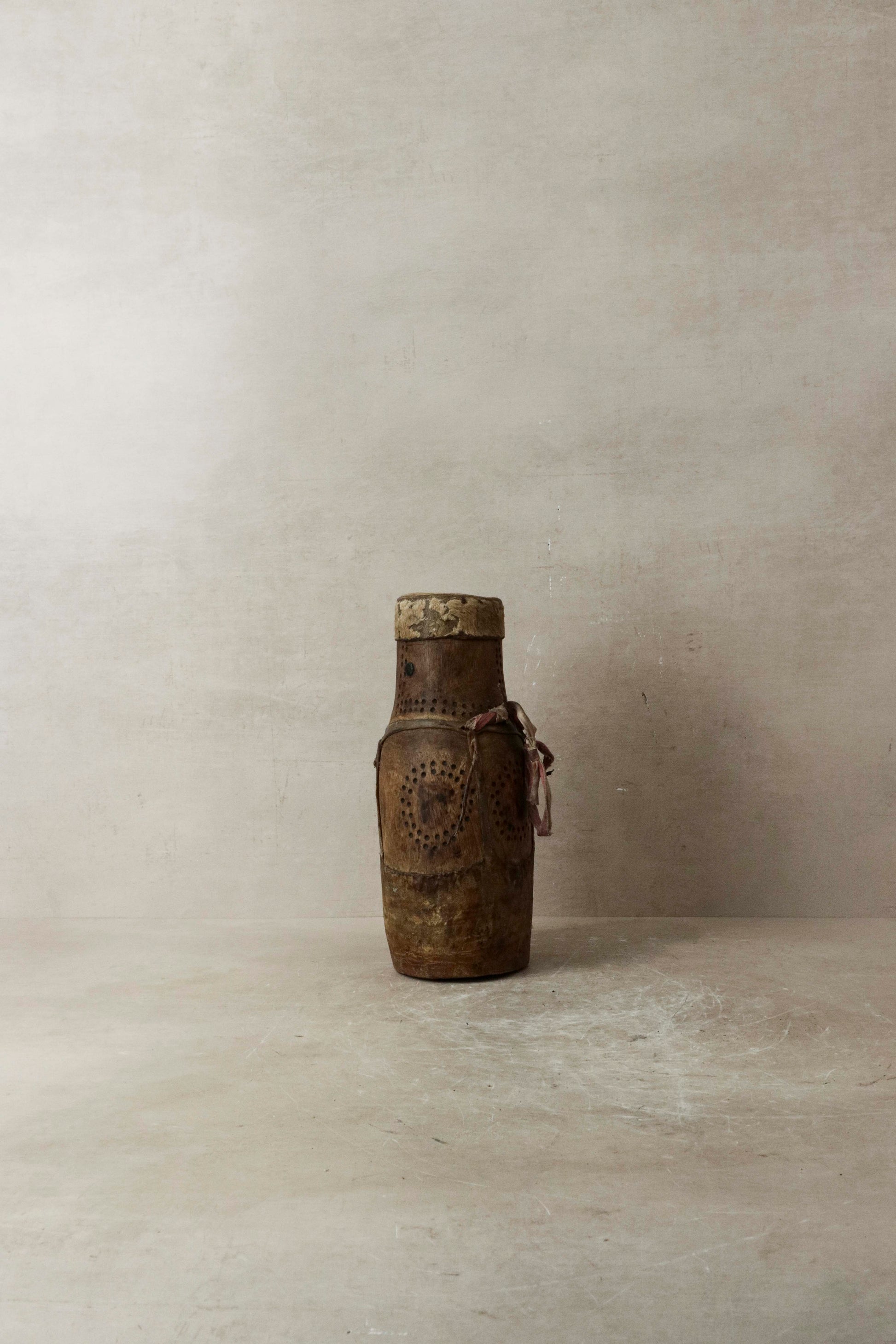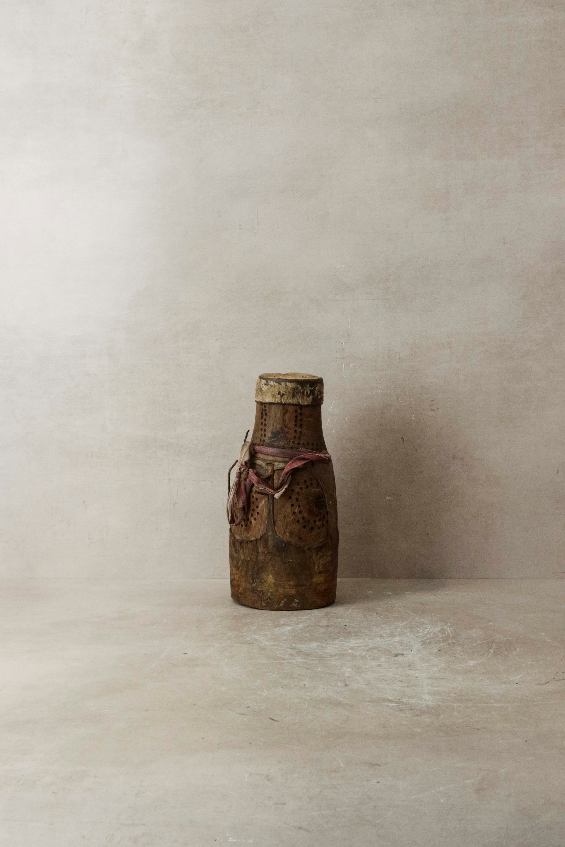 These honey containers are hand carved by the Turkana people from Kenya and used to store honey. Each container is unique and goat leather is used to add to the functionality of this item often as lids, straps to carry around and adornments making these stunning pieces. These pieces show a beautiful patina due to the age of this item.