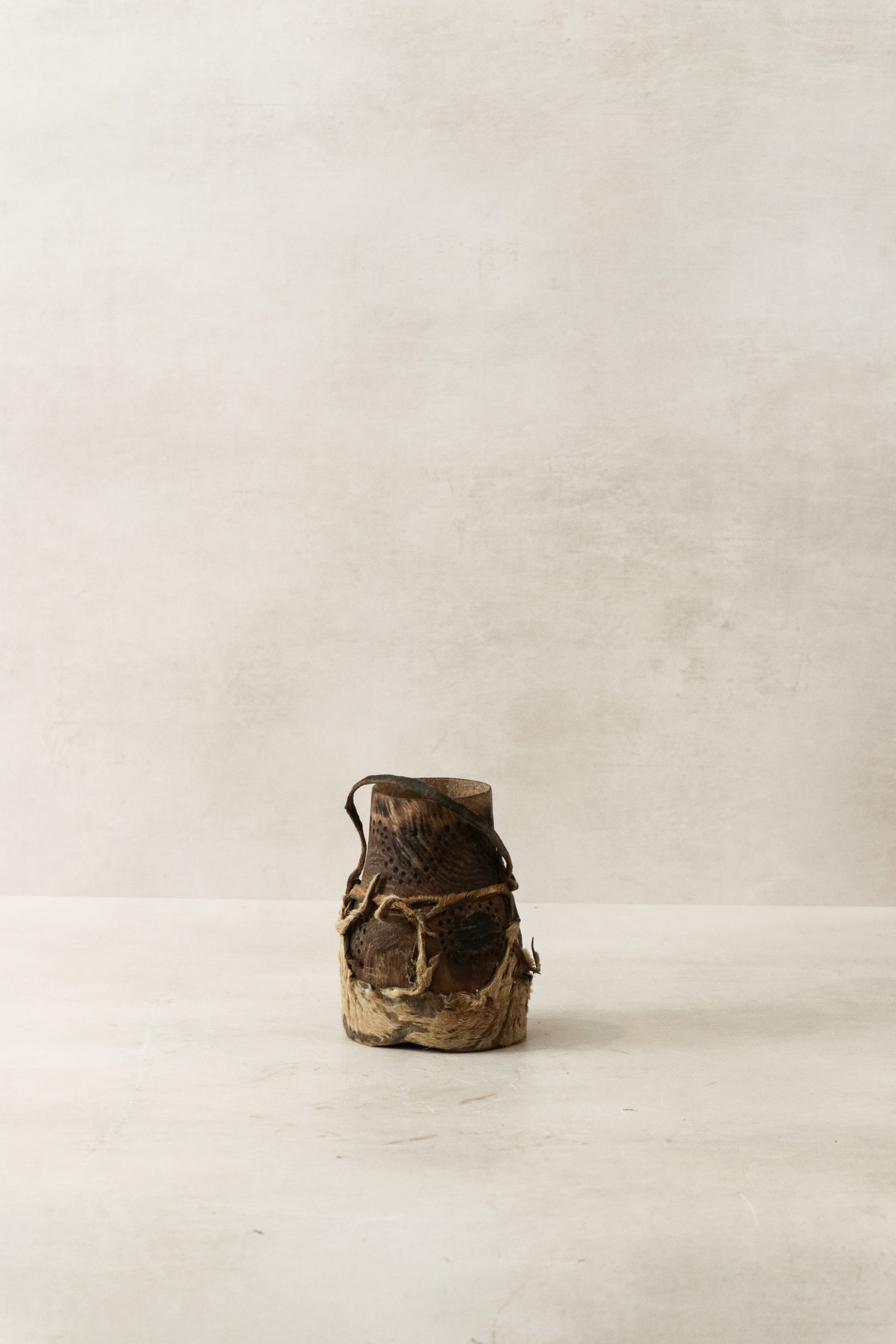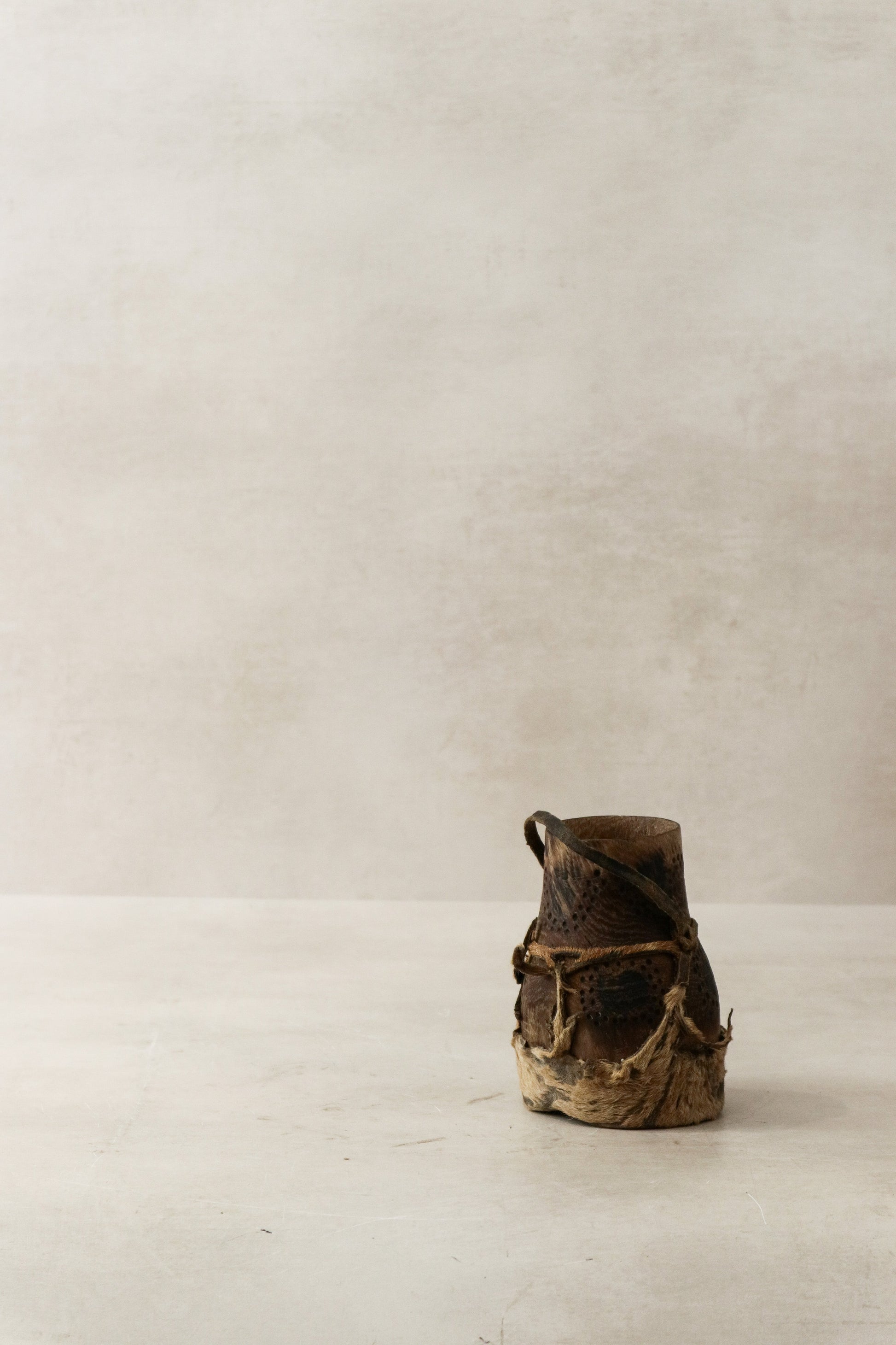 These honey containers are hand carved by the Turkana people from Kenya and used to store honey. Each container is unique and goat leather is used to add to the functionality of this item often as lids, straps to carry around and adornments making these stunning pieces. These pieces show a beautiful patina due to the age of this item.