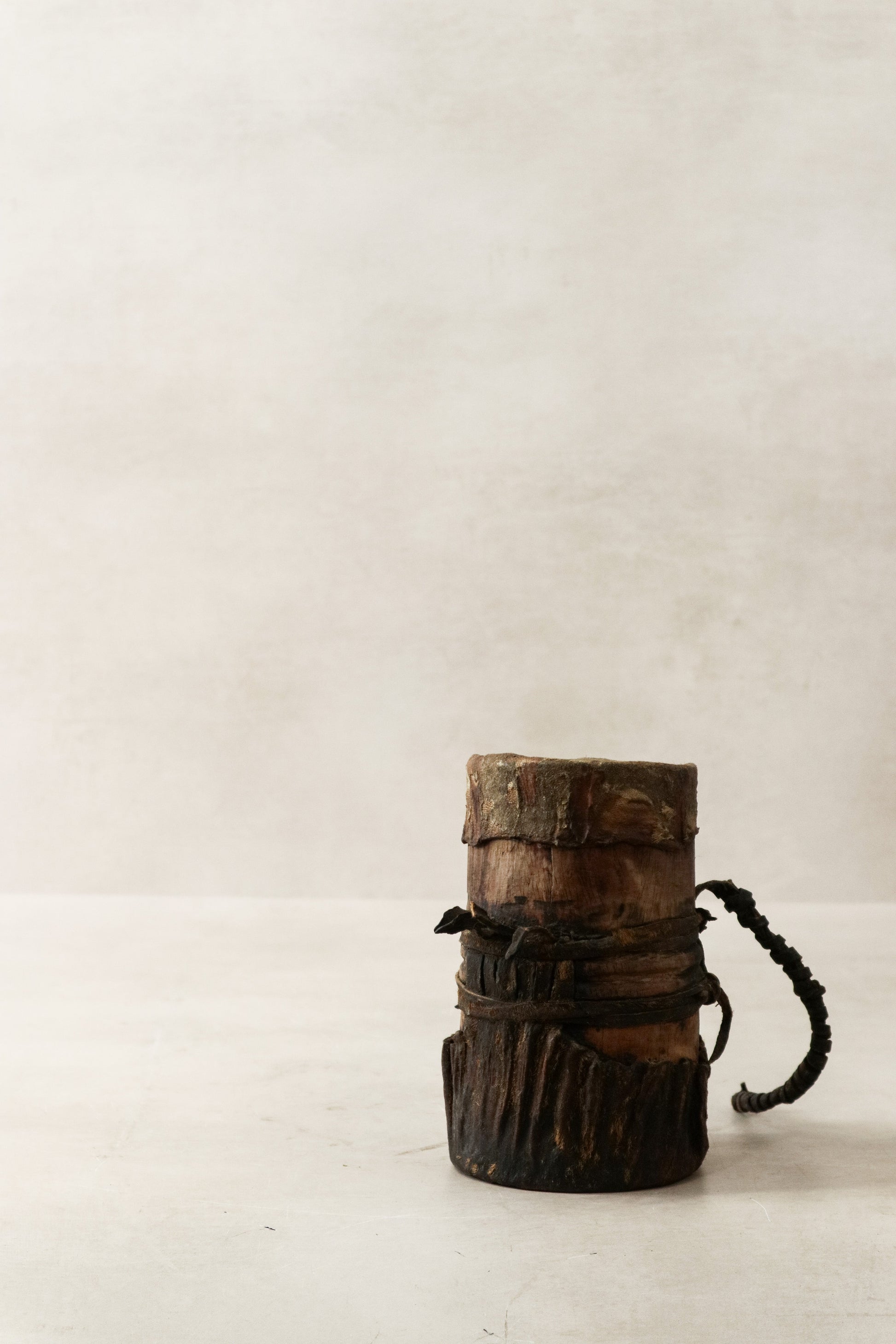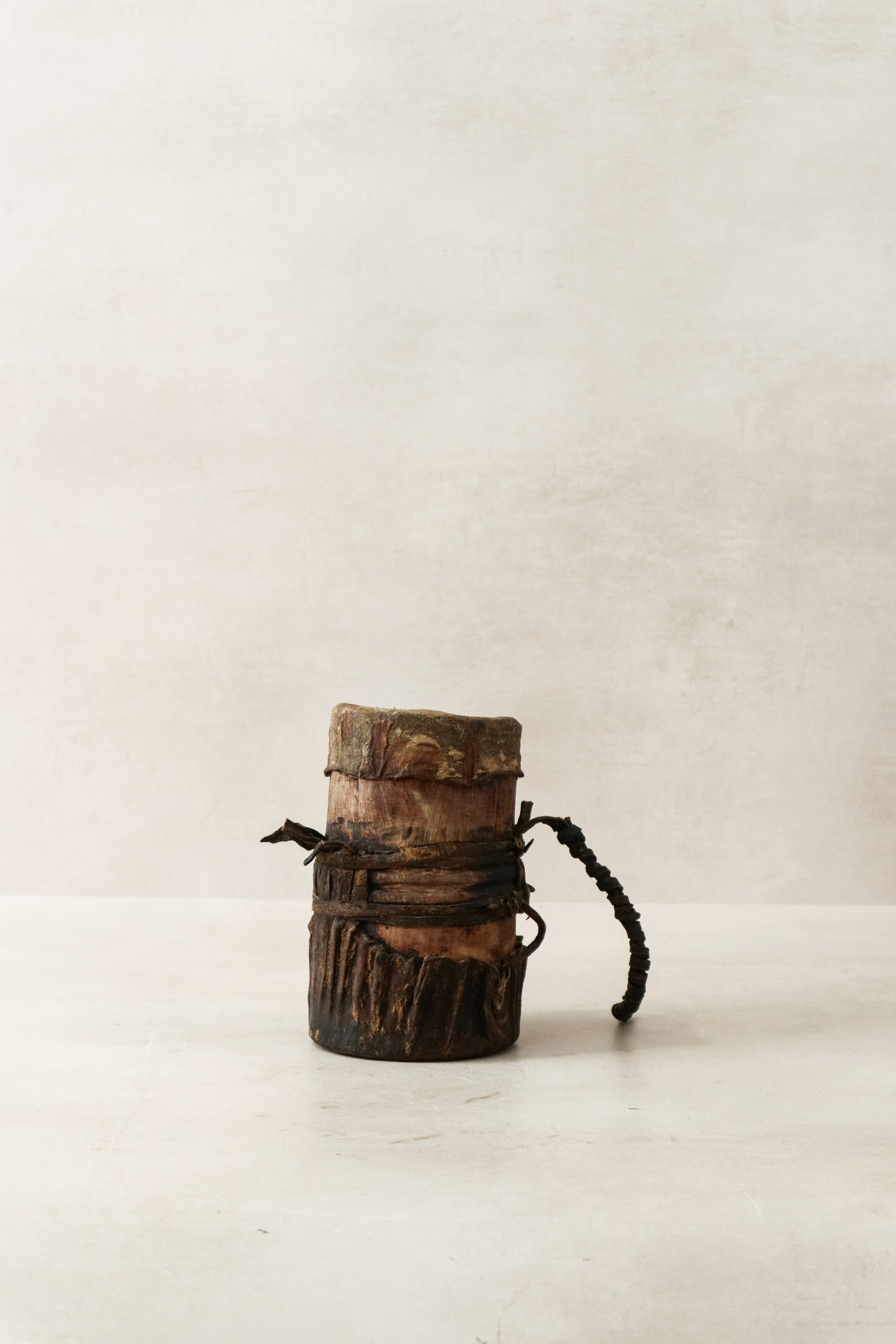 These honey containers are hand carved by the Turkana people from Kenya and used to store honey. Each container is unique and goat leather is used to add to the functionality of this item often as lids, straps to carry around and adornments making these stunning pieces. These pieces show a beautiful patina due to the age of this item.