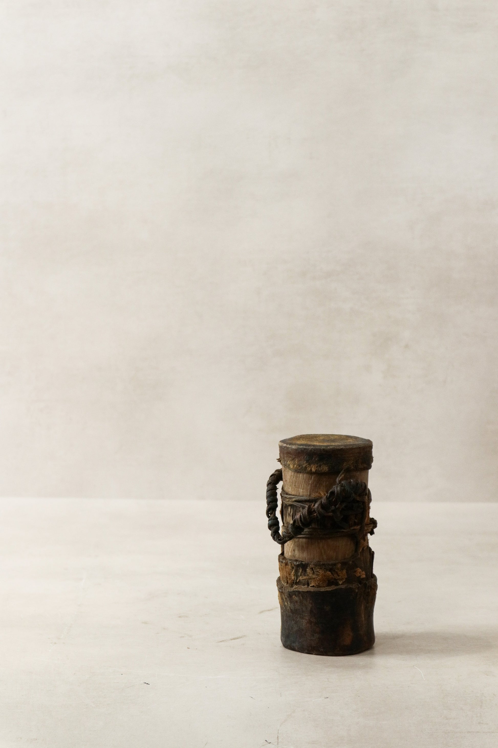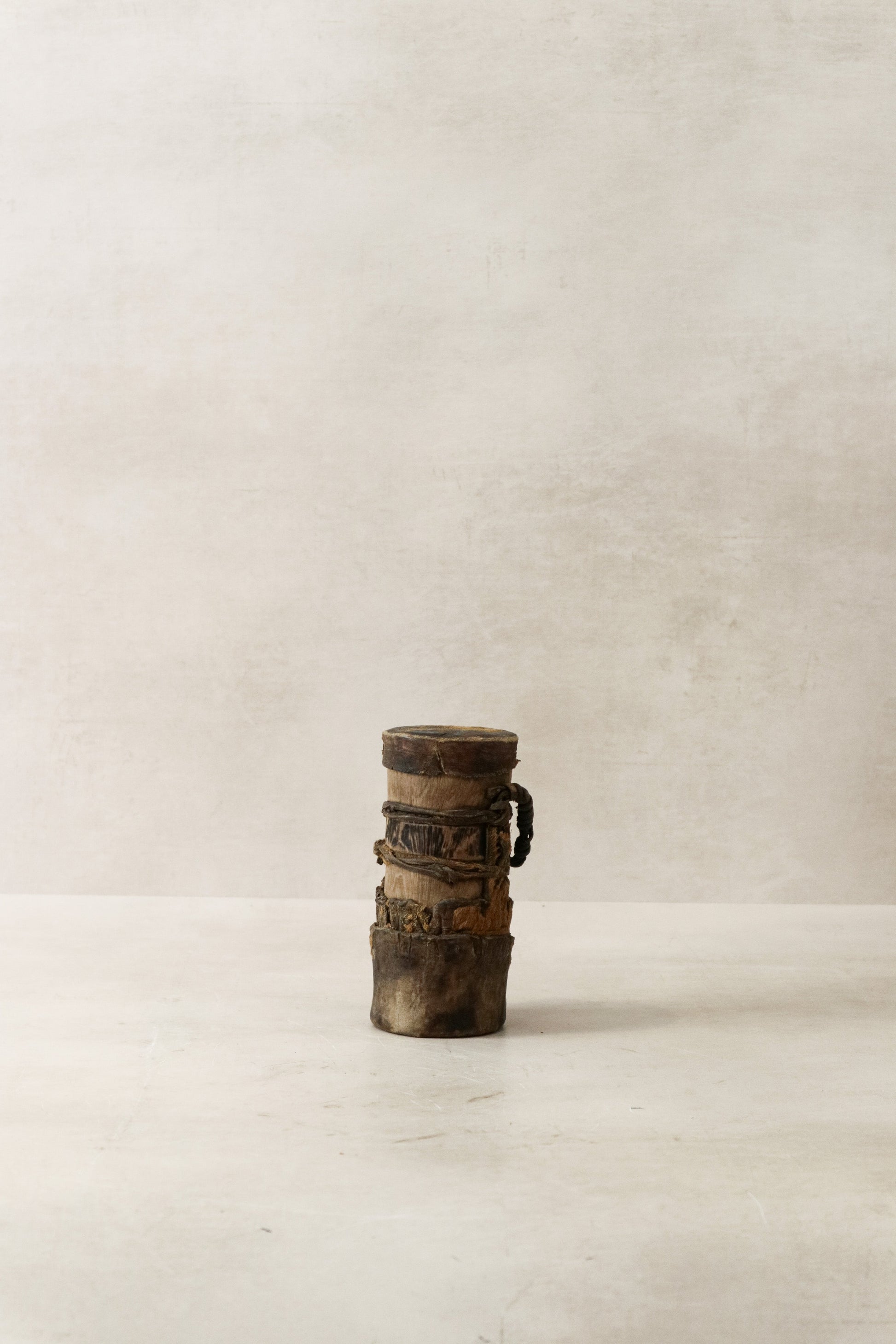 These honey containers are hand carved by the Turkana people from Kenya and used to store honey. Each container is unique and goat leather is used to add to the functionality of this item often as lids, straps to carry around and adornments making these stunning pieces. These pieces show a beautiful patina due to the age of this item.