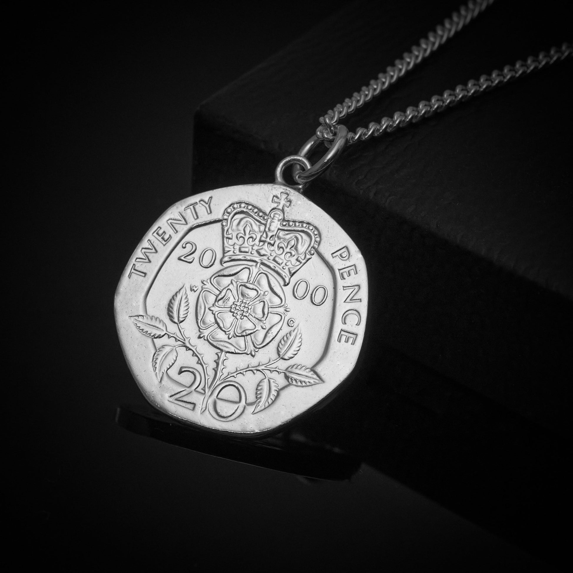 This necklace has been made using a Twenty Pence. This coins design displays the English rose with the crown above.