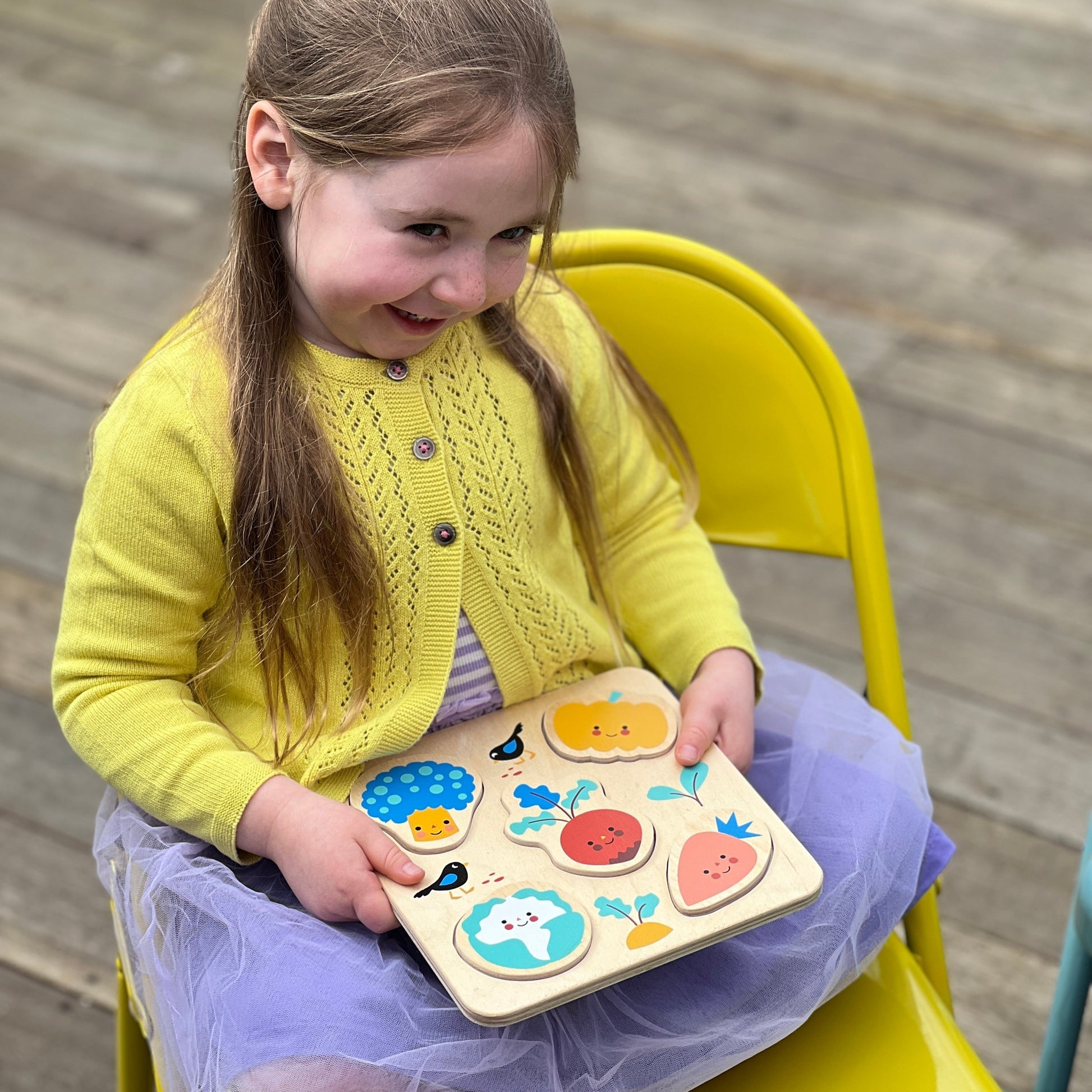 This wooden shape-sorting puzzle includes 5 removable illustrated vegetables.