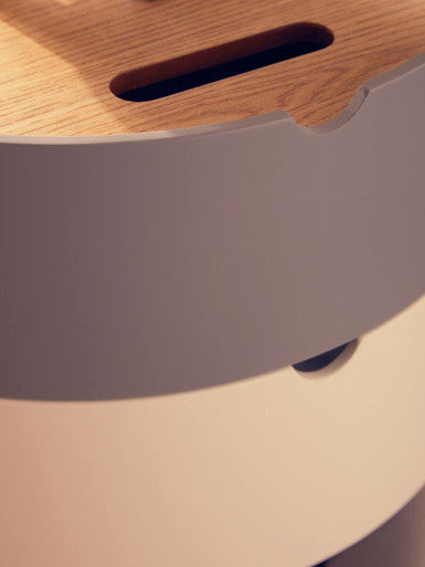 Standing on tripod style pine wood legs, the Viborg three tier storage side table is a smart way to store everyday use items in the living room. This elegant side table has white, grey, and black storage compartments stacked over each other with semi-circular holes for lifting them. A round natural finish wooden lid with hole acts as the table top, offering surface for serving snacks or placing a cup.