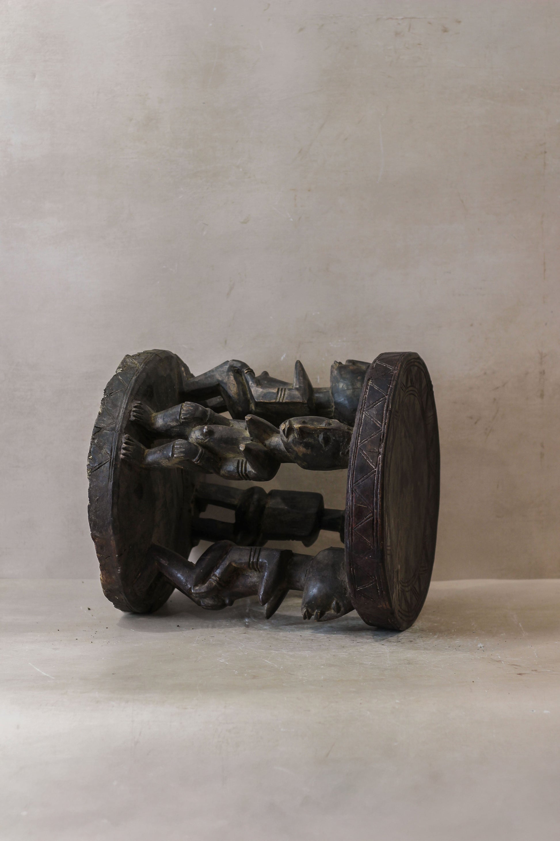 This Baule wood carved vintage stool is a stunning piece of traditional African craftsmanship. Hand-carved from solid wood by the Baule people, it features intricate patterns and smooth contours, reflecting the cultural artistry of its origins. The stool's rich, natural patina has developed over time, enhancing its vintage appeal. Its sturdy yet elegant design makes it a versatile accent, perfect for adding a touch of history and character to any space. Whether used as seating, a side table, or a decorative object, this stool is a unique and timeless addition to any collection.