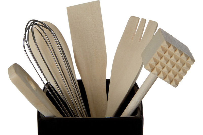 The ceramic holder is weighty enough to stay put as you reach for tools yet compact enough to tuck neatly beside your hob or sink. Inside you will find a practical selection that typically includes a whisk for batters and sauces, a tenderiser for preparing cutlets, a spatula for nonstick pans, a stirring spoon for soups and stews, and additional essentials suited to daily tasks. Handles are comfortable in hand, and the mix of utensils covers sweet and savoury cooking without clutter.