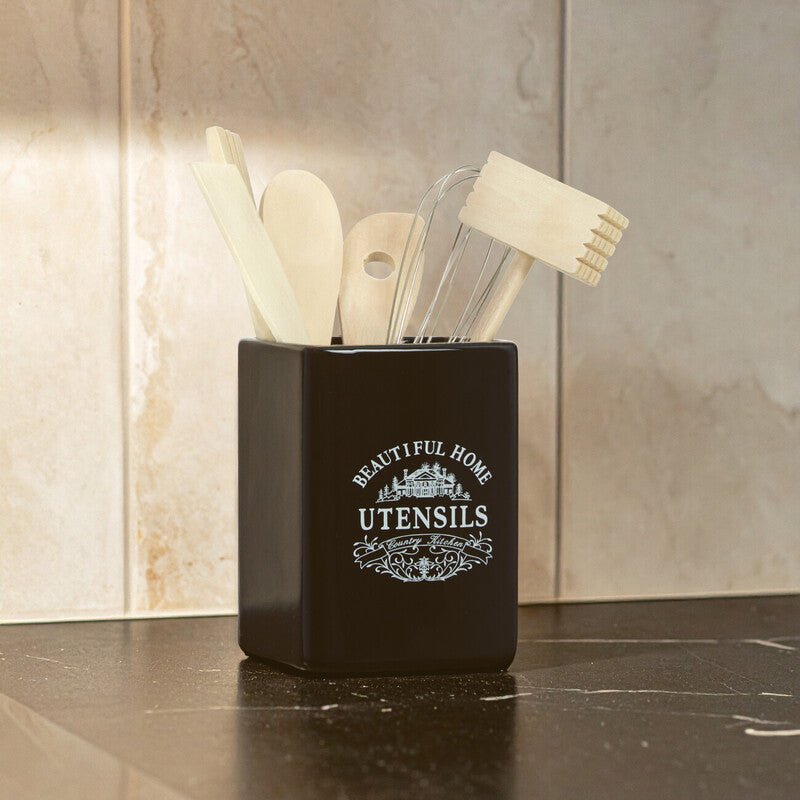 Streamline your prep zone with the Vintage Home Black Utensil Holder with 6 Utensils from Orsina, complete with six essential tools to cover everyday cooking. Introduce the Vintage Home Utensil Holder to your worktop, and you gain both a stylish organiser and a ready-to-use kit for whisking, flipping, stirring, and tenderising. The glossy black ceramic jar showcases nostalgic lettering that brings warmth to contemporary and traditional kitchens alike.