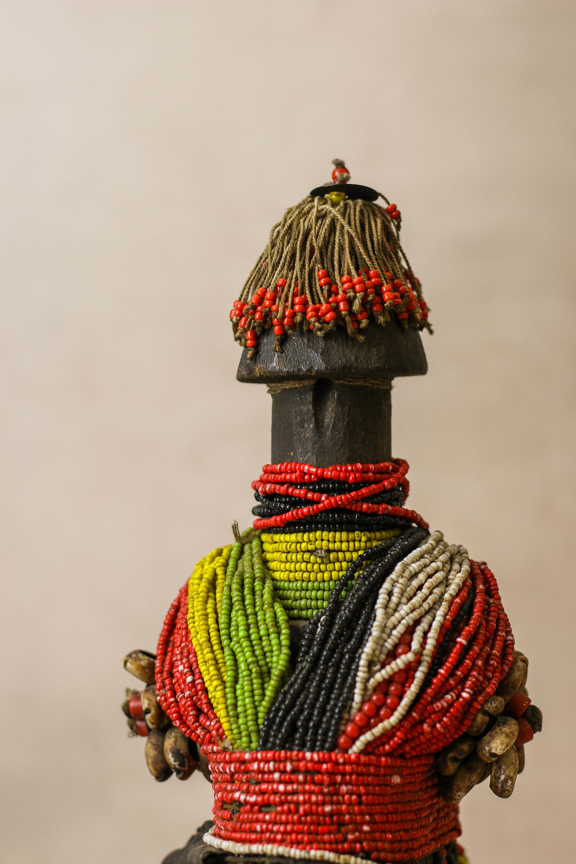 Historical Detail : Namchi/Namji dolls are carved from African Rosewood, a legume tree native to the Democratic Republic of Congo, Cameroon, Gabon and Equatorial Guinea. A single block of African Rosewood wood is hand carved into a geometric shape and decorated with multi coloured beads, metals, fibre, cowrie shells, coins, and even leather. Each doll is carved with a unique stature and facial expression. Unadorned dolls made by blacksmiths are played with by young children.