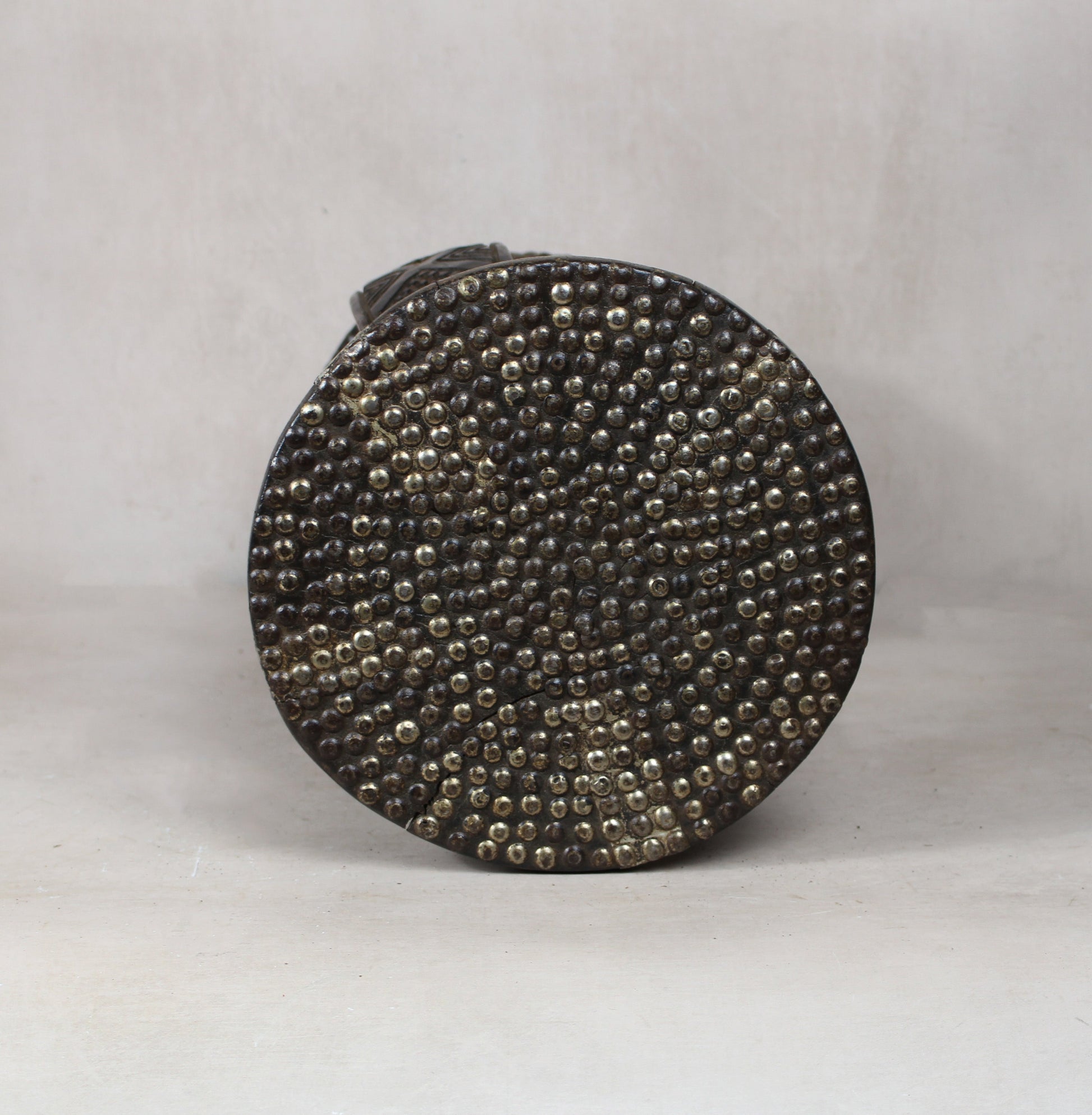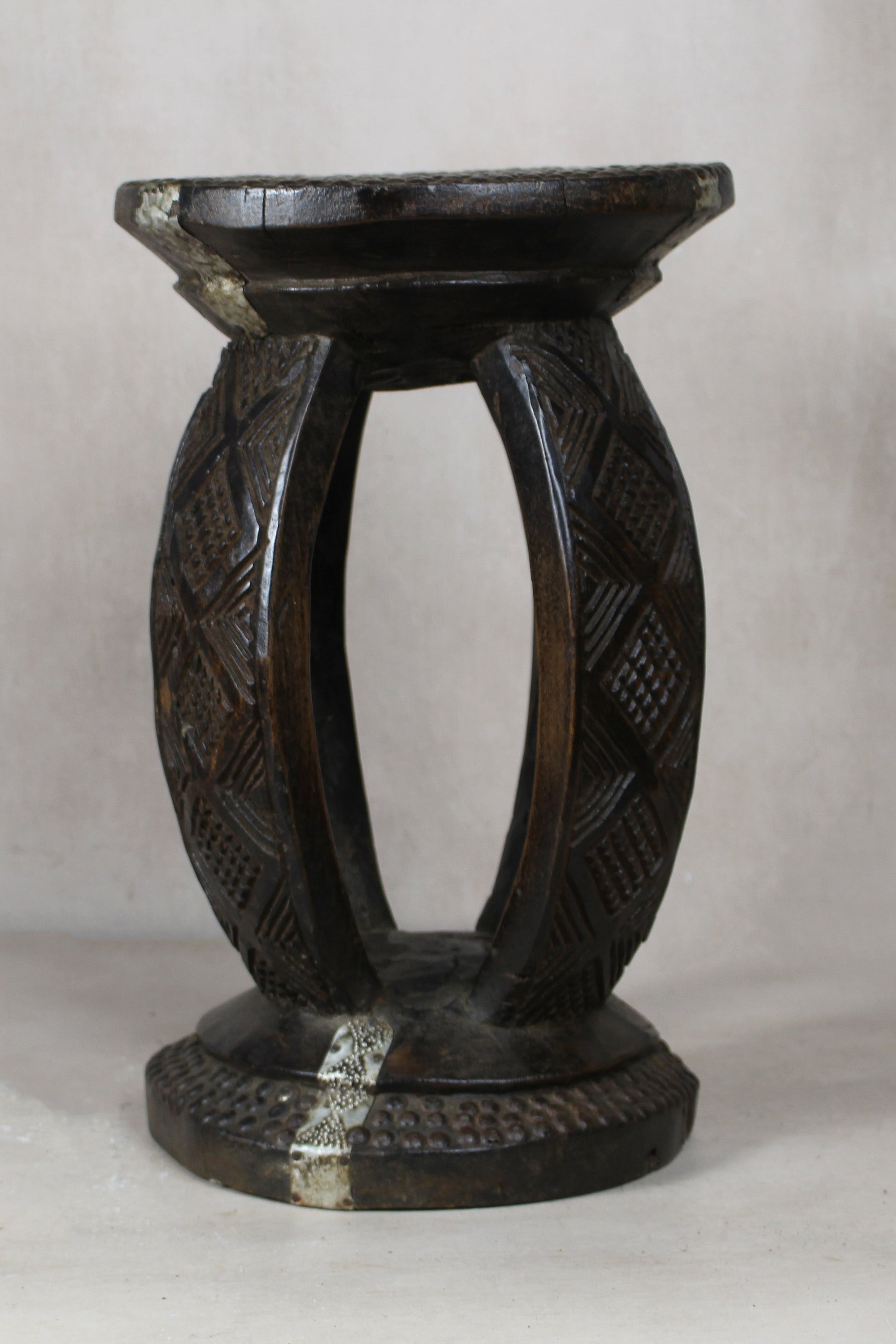 This carved vintage stool is a stunning piece of traditional African craftsmanship. Hand-carved from solid wood, it features intricate patterns and smooth contours, reflecting the cultural artistry of its origins. The stool's rich, natural patina has developed over time, enhancing its vintage appeal. Its sturdy yet elegant design makes it a versatile accent, perfect for adding a touch of history and character to any space. Whether used as seating, a side table, or a decorative object, this stool is a unique and timeless addition to any interior. Embellished with metal add to its distinct design.