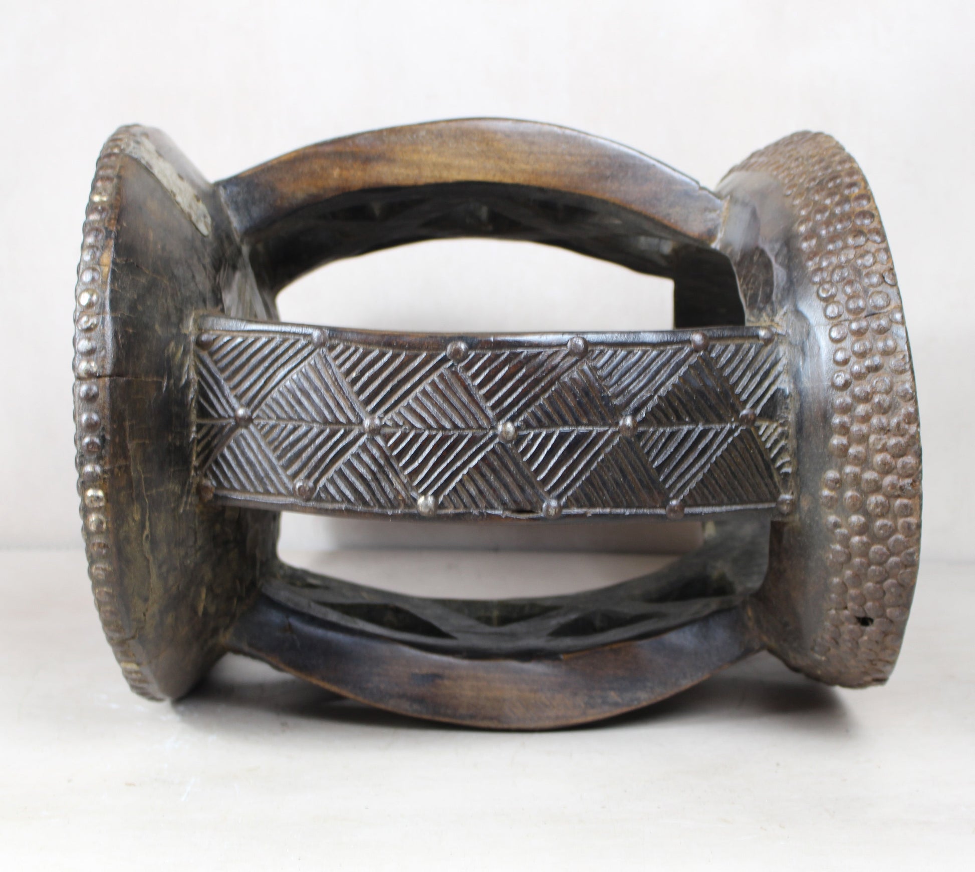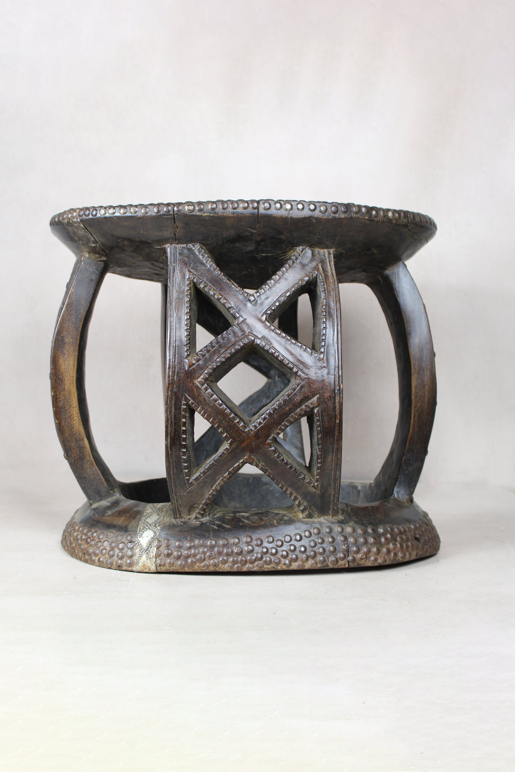 This carved vintage stool is a stunning piece of traditional African craftsmanship. Hand-carved from solid wood, it features intricate patterns and smooth contours, reflecting the cultural artistry of its origins. The stool's rich, natural patina has developed over time, enhancing its vintage appeal. Its sturdy yet elegant design makes it a versatile accent, perfect for adding a touch of history and character to any space. Whether used as seating, a side table, or a decorative object, this stool is a unique and timeless addition to any interior. Embellished with metal add to its distinct design.