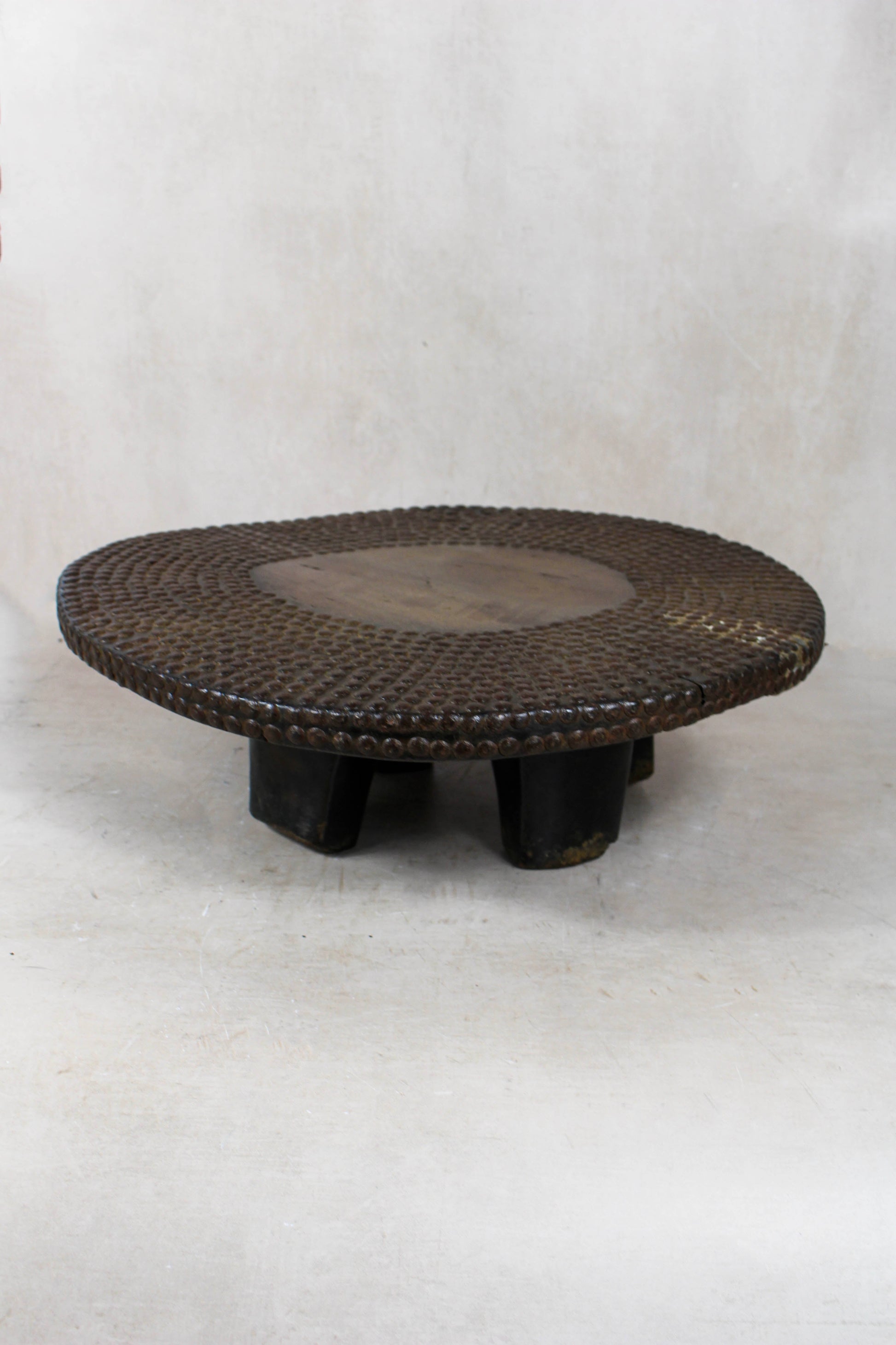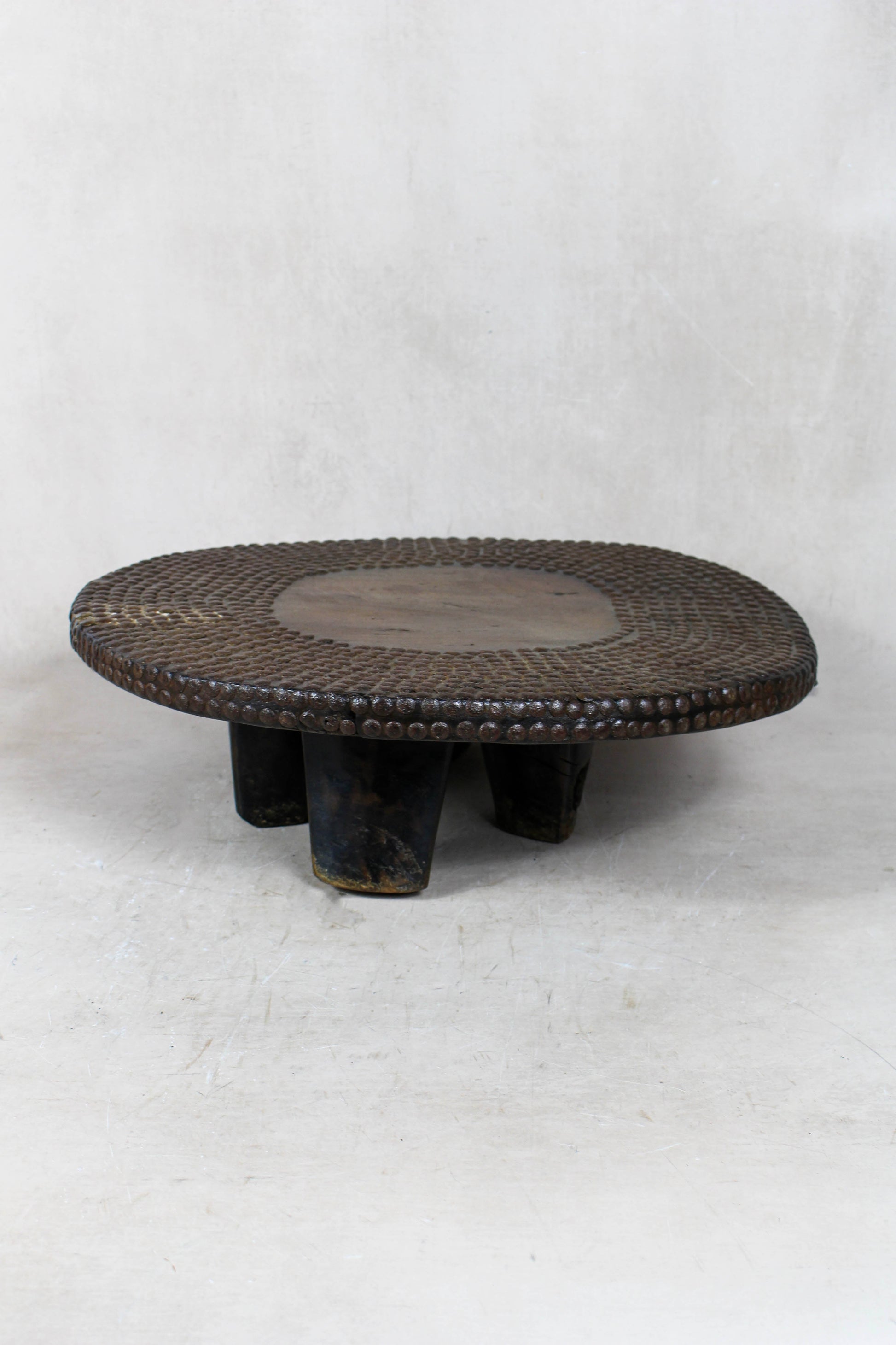 This carved vintage stool is a stunning piece of traditional African craftsmanship. Hand-carved from solid wood, it features intricate patterns and smooth contours, reflecting the cultural artistry of its origins. The stool's rich, natural patina has developed over time, enhancing its vintage appeal. Its sturdy yet elegant design makes it a versatile accent, perfect for adding a touch of history and character to any space. Whether used as seating, a side table, or a decorative object, this stool is a unique and timeless addition to any interior. Embellished with metal add to its distinct design.